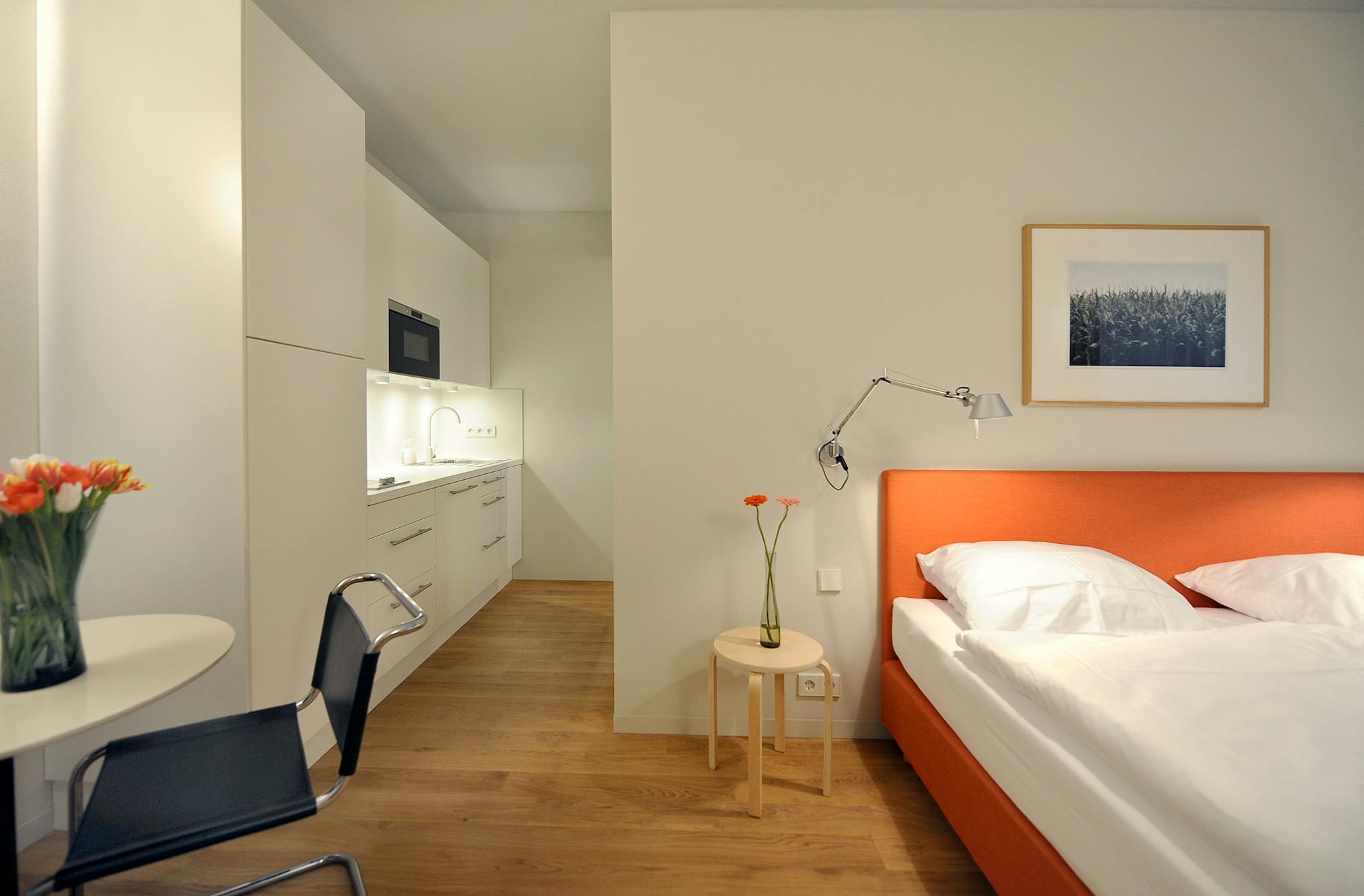 This studio-apartment is generously furnished (LED flat-screen TV, DVD player, HIFi etc.), comes with a fully equipped modern kitchenette and a living-/bedroom for two persons.