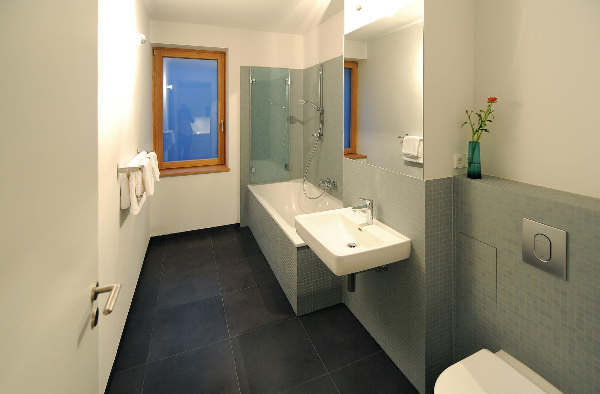 The bathroom contains a spacious bath tub for two with centrally-positioned drain and shower partition, WC and washbasin.