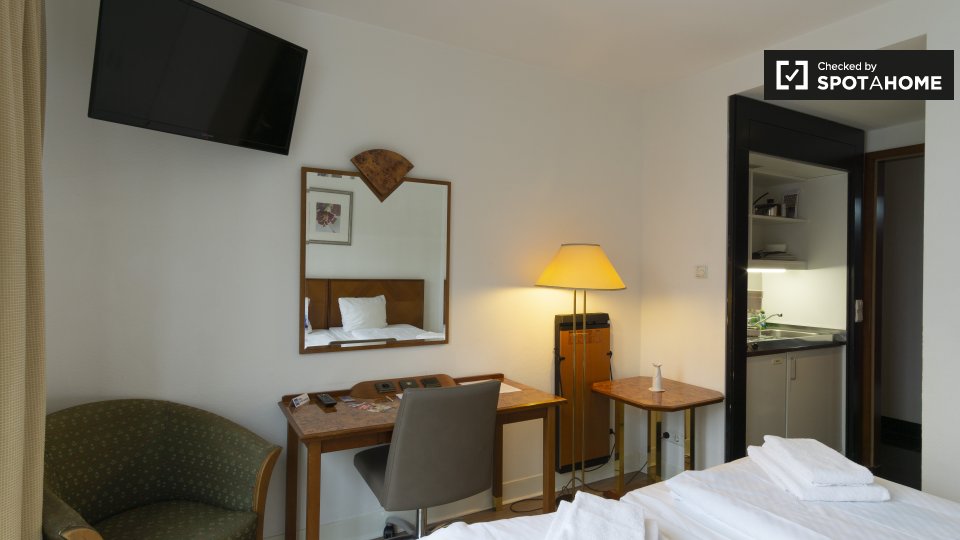 The Apartment has a modern heating system embedded under the wooden parquet floor. Moreover, the apartment is equipped with beside tables, an office desk with chair, an armchair and a TV and has a free high-quality internet Wi-fi. The tenants could store their things well and feel free to use the built-in wardrobes of the apartment and get the home feeling.