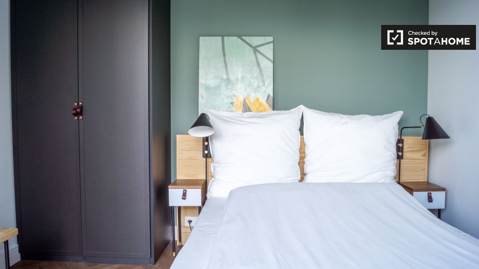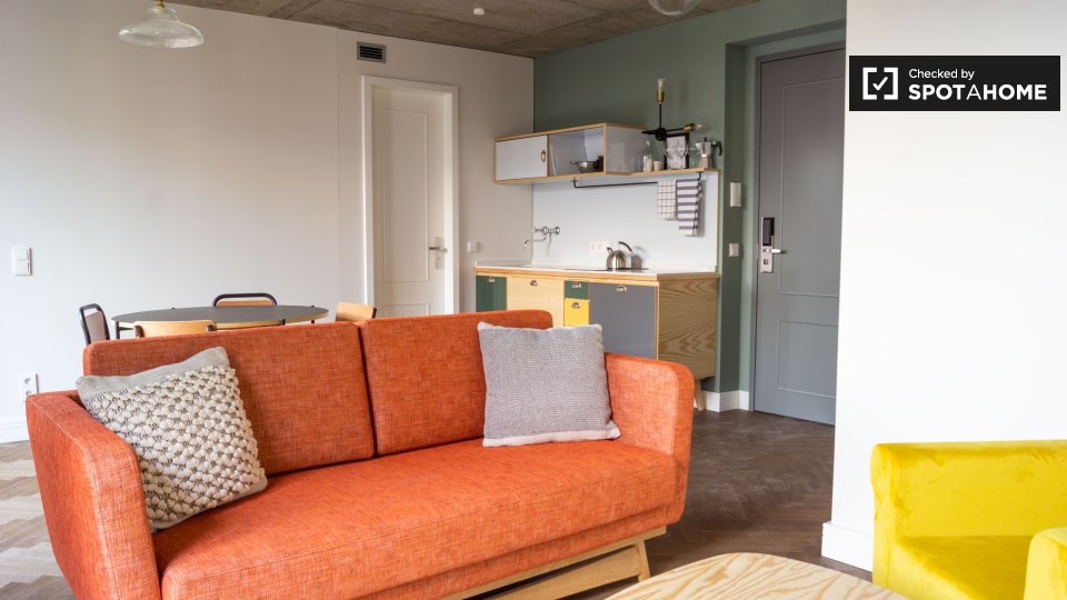 Pets not allowedNot allowedThis chic apartment with 2 bedrooms to rent on Brunnenstraße is located in Mitte, Berlin. It’s an open space apartment with a cozy bedroom and modern bathroom. Both bedrooms have wardrobes and French balconies. The combined kitchen, living and dining area has a retro mid-century mod decor. The kitchen is fully equipped, and the rest of the area is furnished with a dining table, sofa, armchairs and TV. The bathroom is modern with a tub, and the building has a common laundry facility.