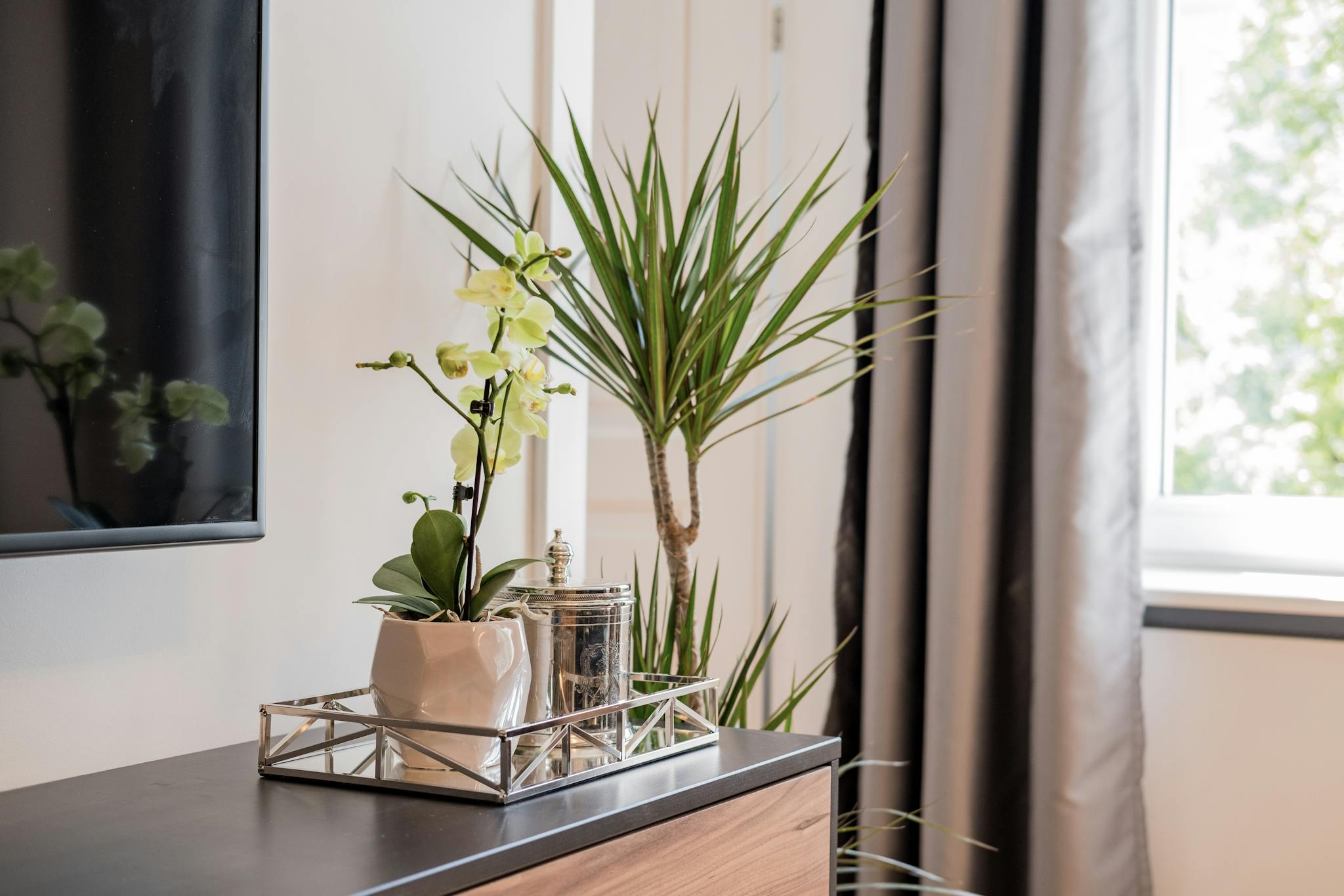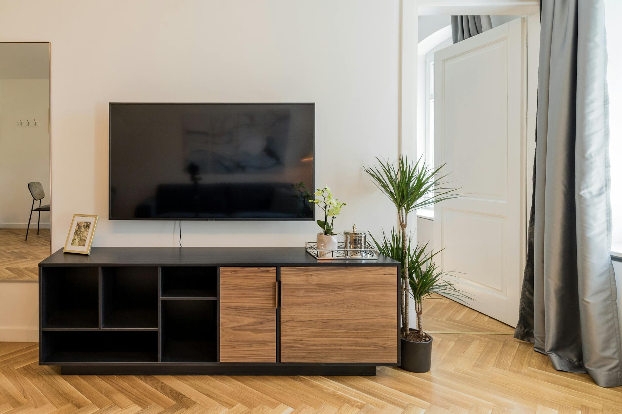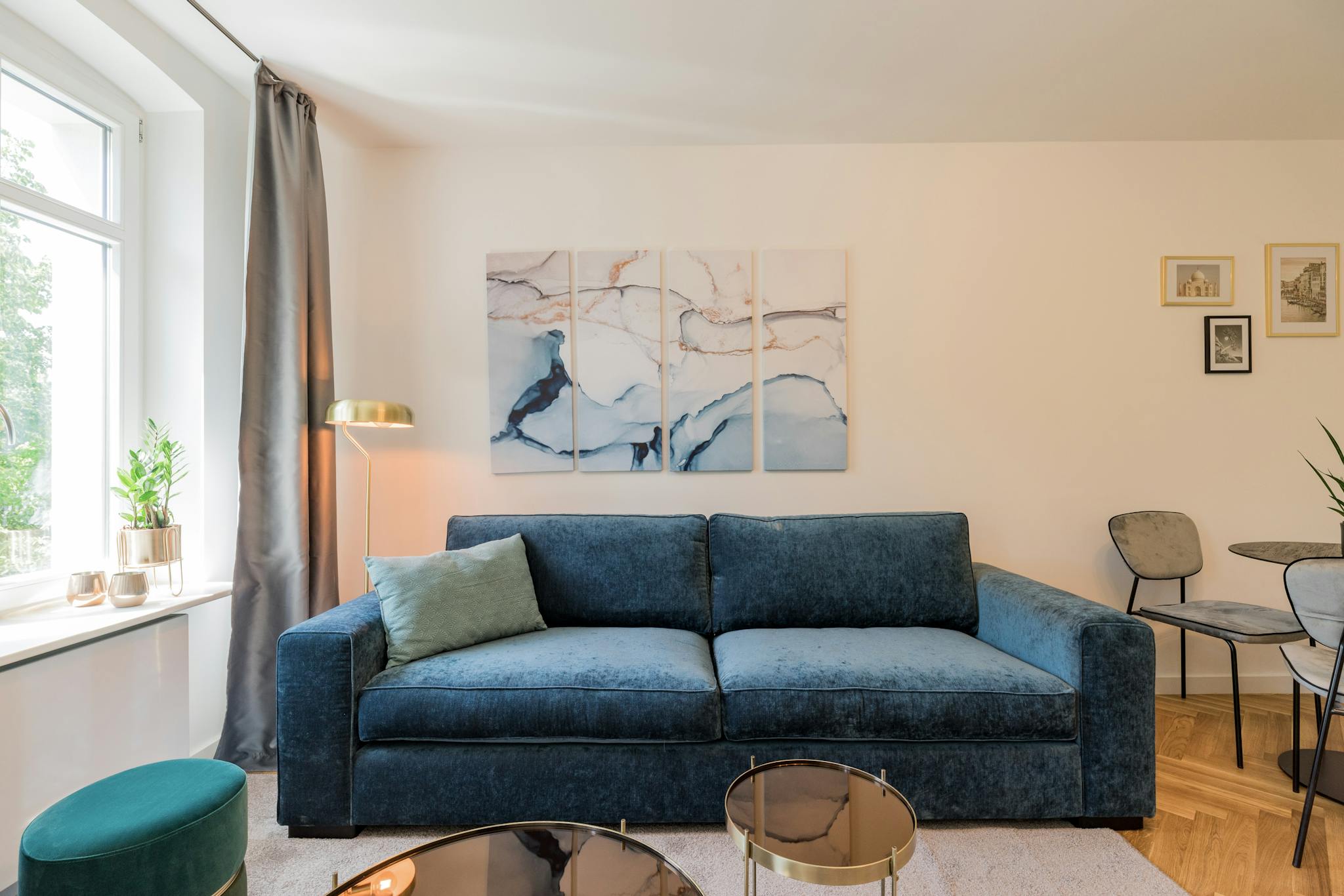 After work, you can relax on the beautiful couch and enjoy a movie on the large flat screen.