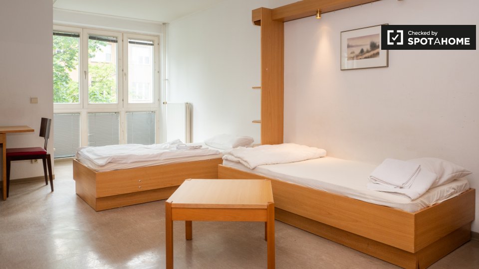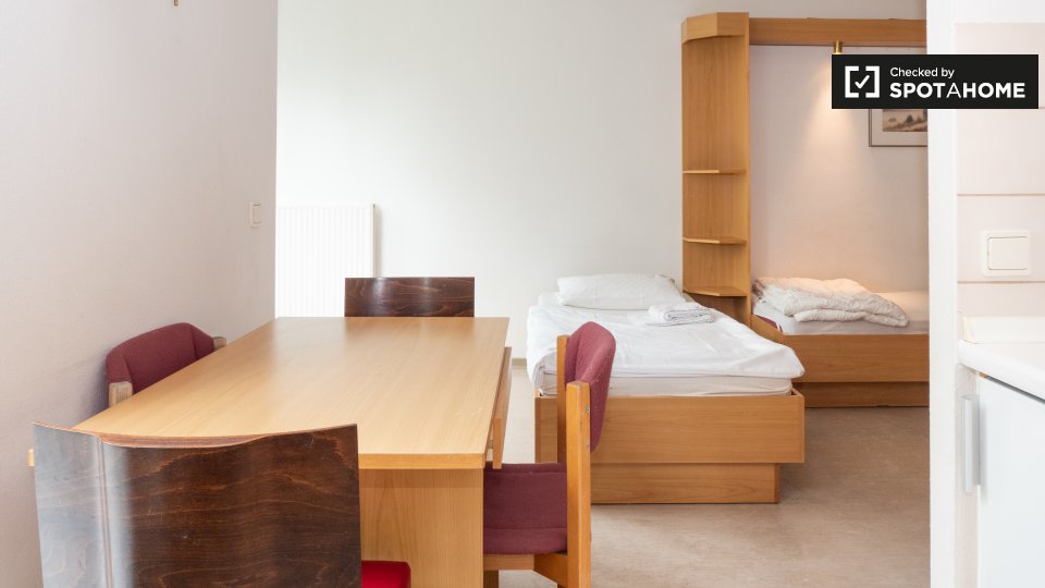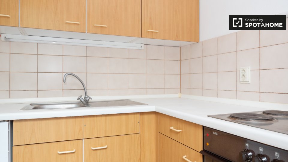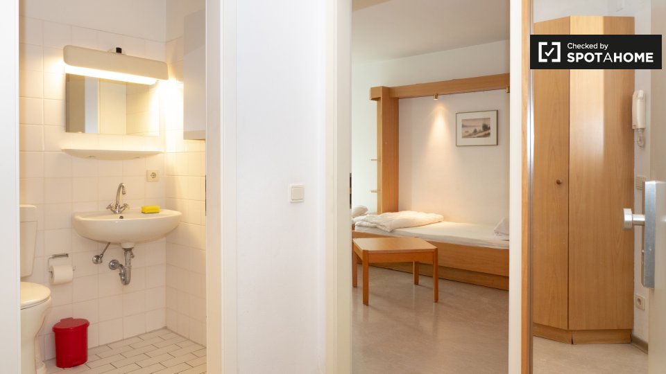 This is a studio apartment on Kreuznacher Straße, Berlin. The sun-filled studio has plenty of storage and a fully equipped kitchen.