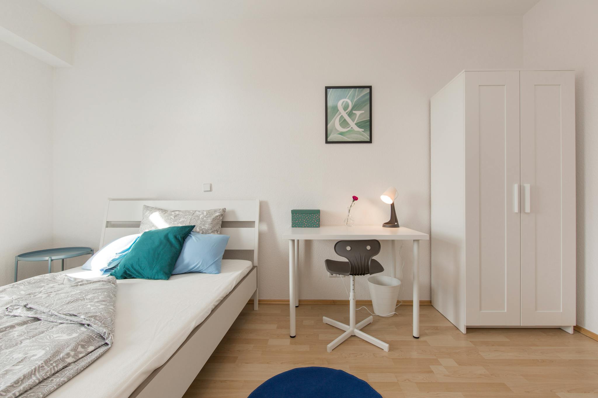 Fully furnished with a comfy bed, desk, chair, and wardrobe.