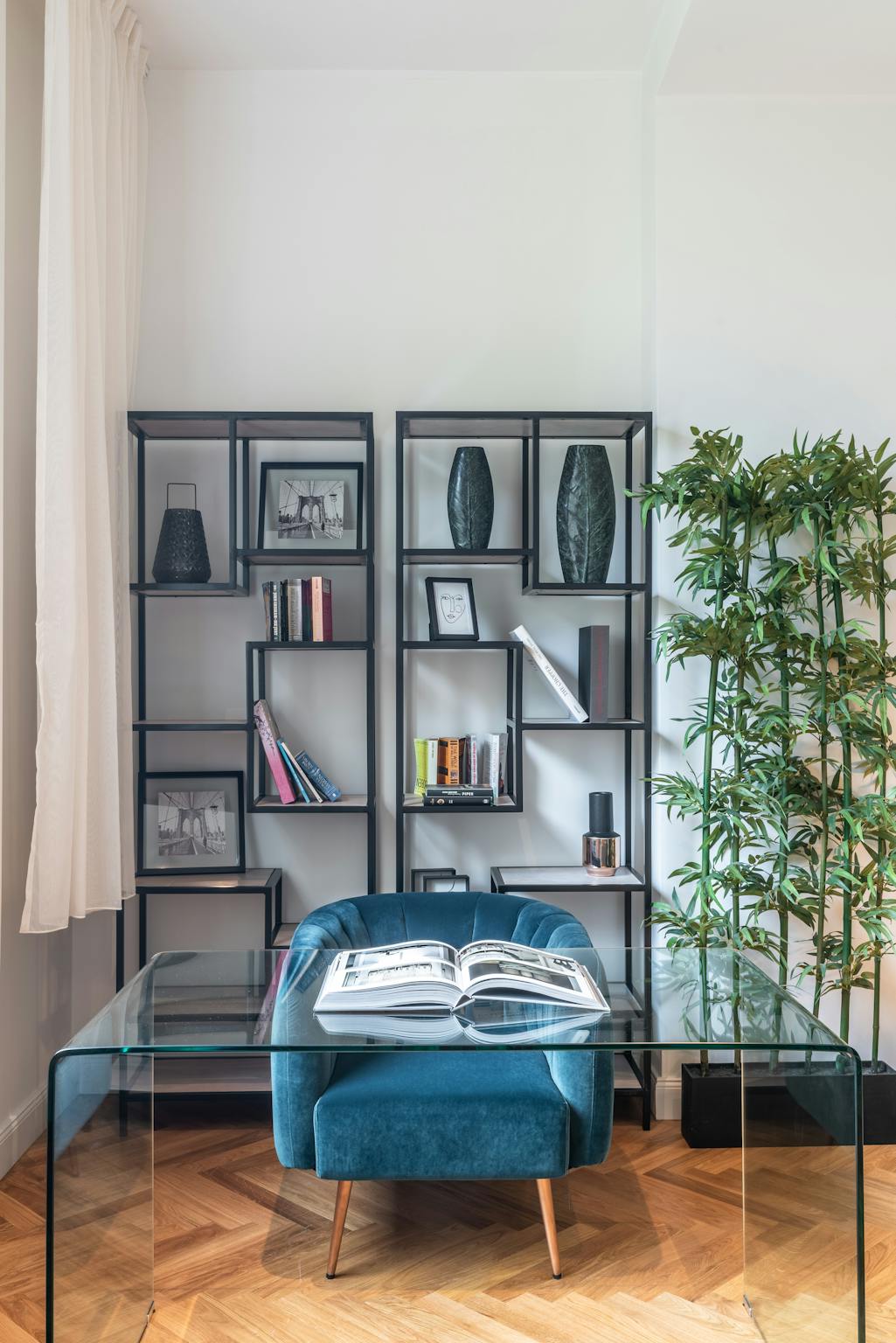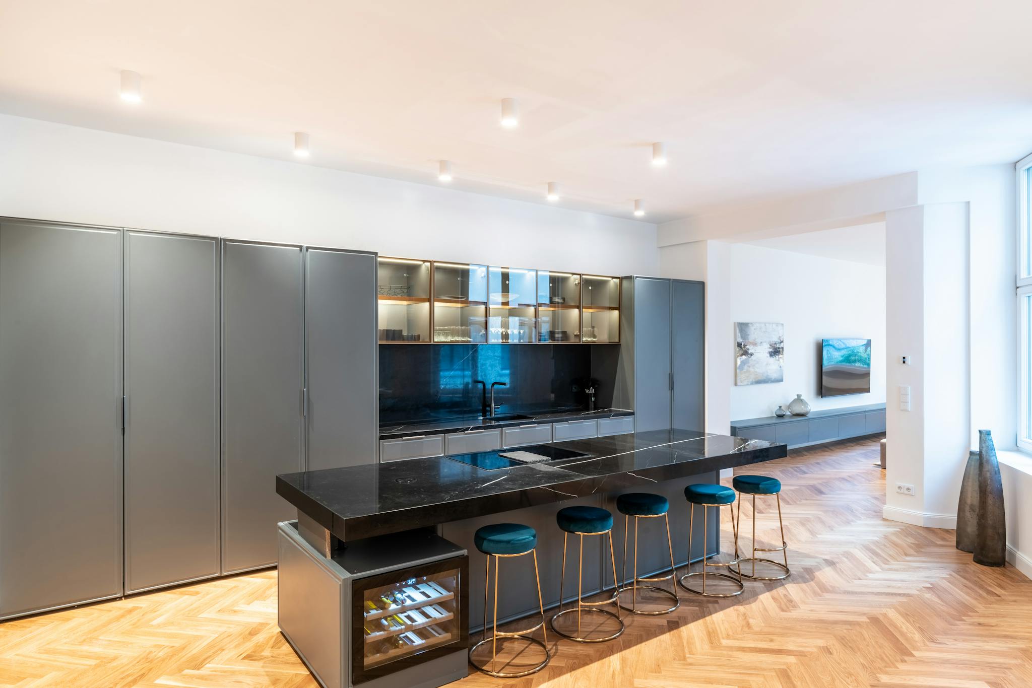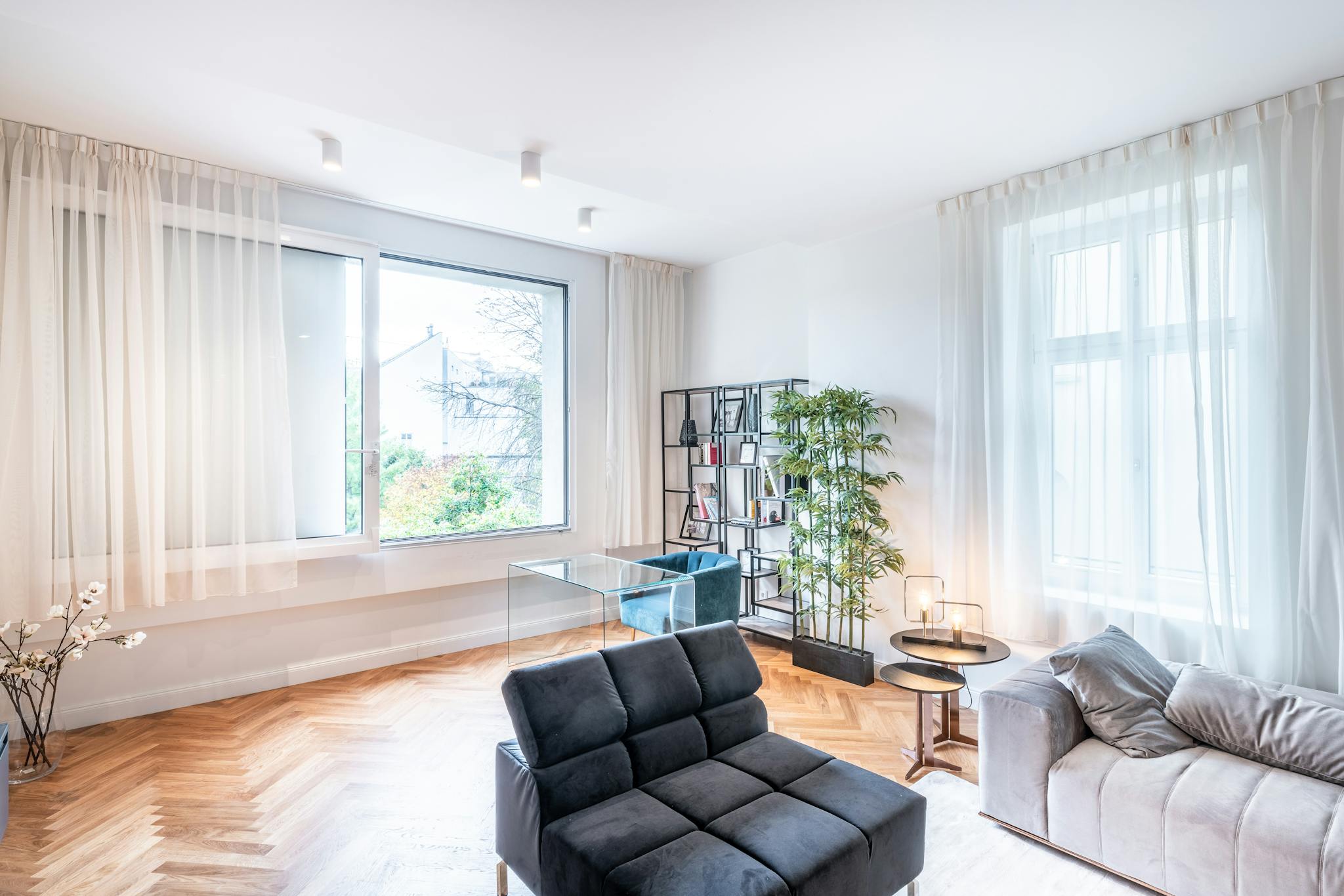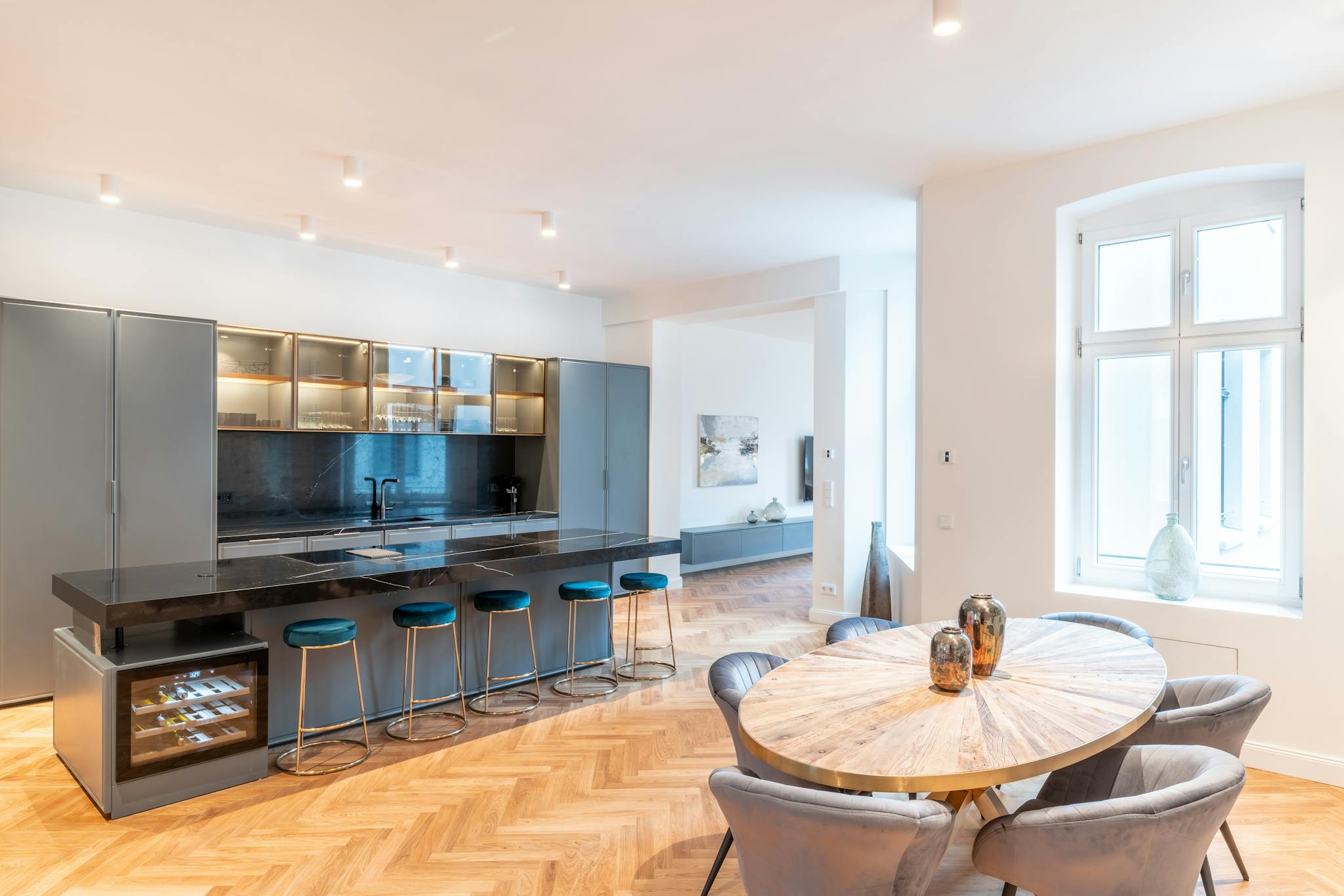 Impressively designed, the apartment features an open floor plan, dedicated living spaces, high ceilings, neutral color scheme, and phenomenal hardwood floors. Carefully laid in a herringbone pattern, the heated flooring is bursting with natural hues of amber, vanilla, and honey. Flooding the space in luminous natural light, the bright windows offer unparalleled serenity. Midcentury modern furniture adds to the panache and gives additional depth and texture with velvet touches and geometric angularity.