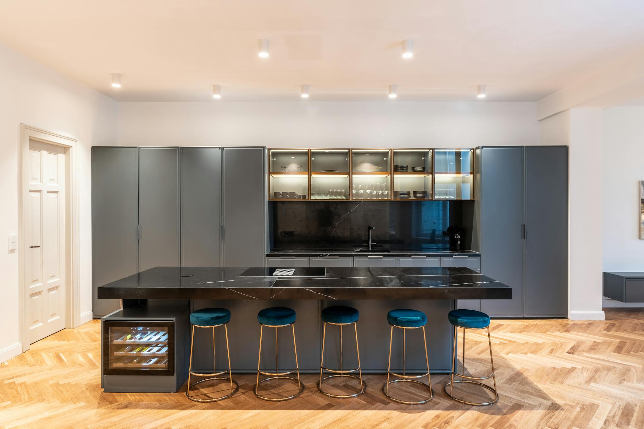 Deep charcoal gray kitchen cabinetry discreetly conceals functionality, such as the dishwasher and large refrigerator and freezer, as the center island adds extra prep space(hidden)anizing wine, spirits, coffee, and dry goods is simple with ample cabinetry. Onyx hues and obsidian black tones dominate the color palette of the sleek countertops and polished backsplash. For the discerning individual, the Bosch induction oven and range assist in creating culinary perfection. Every tool needed to satisfy your culinary cravings is easily accessible and includes plates, cups, and a coffeemaker. For convenience and privacy, a full bath is located near the kitchen.