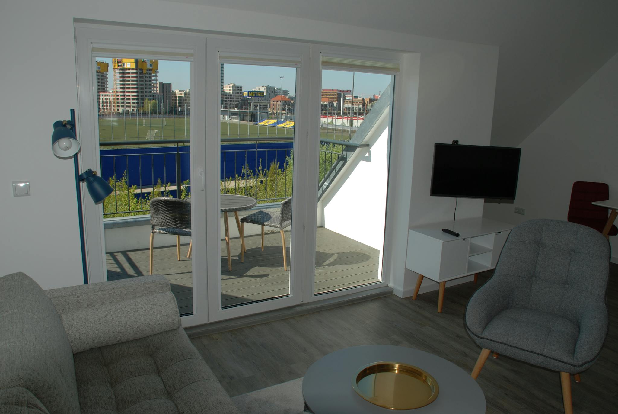 The apartment is within walking distance of Warschauer Str. The associated train stations and stops are within a 4-minute walk. The nearest shops (beverage and supermarket) are 300 meters away. The East Side Mall is also 4 minutes away and the adjacent Rewemarkt is open 24 hours a day during the week.
