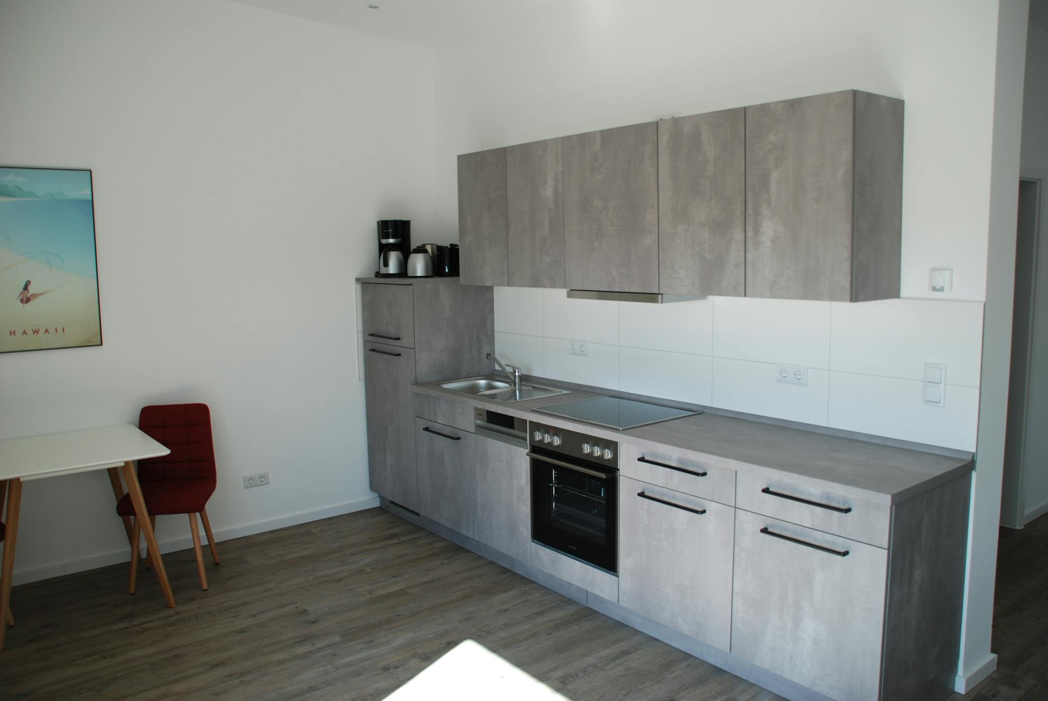 The separate kitchen with fully equipped kitchenette is spacious and has a table with 2 chairs.