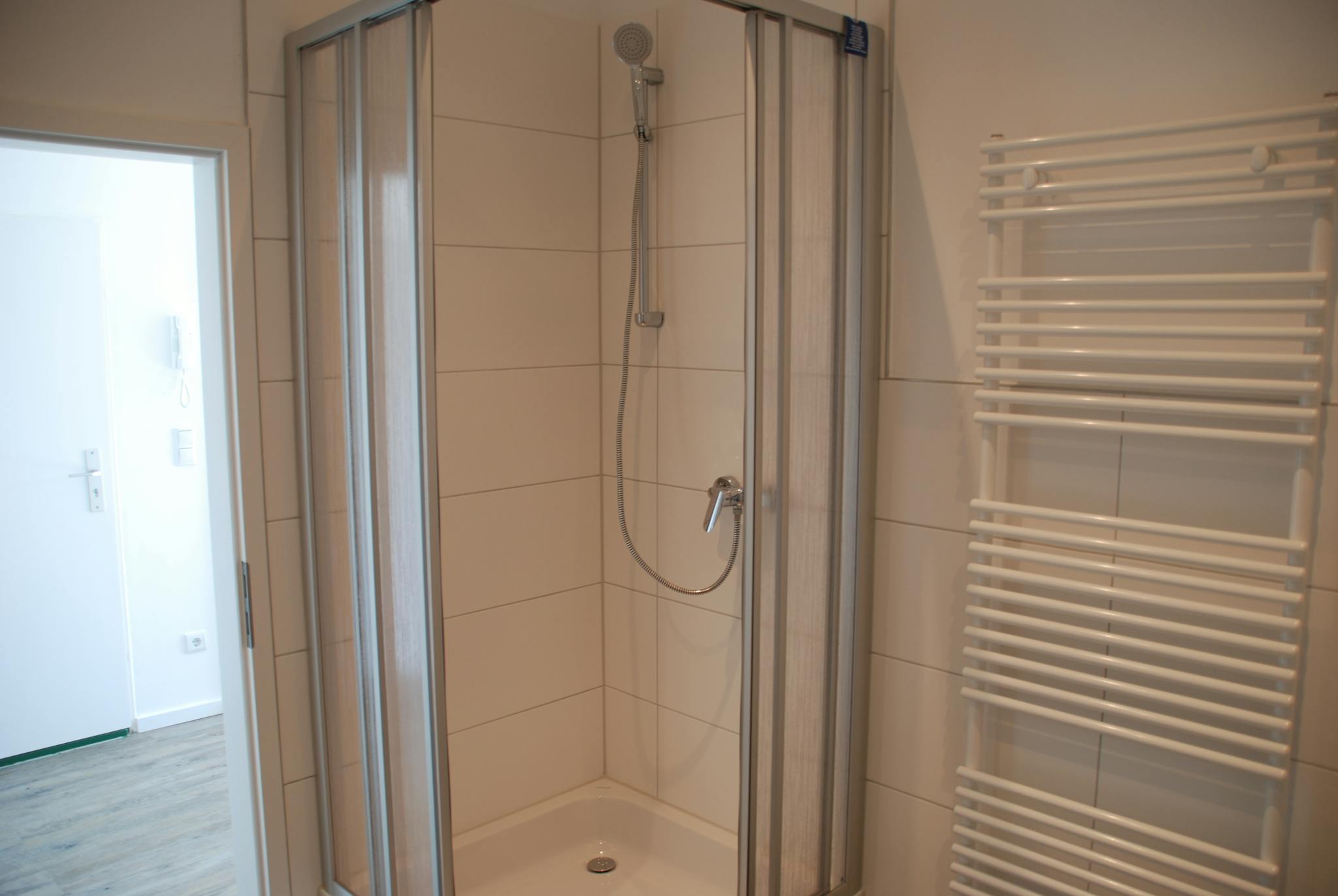 The bathroom has a shower cubicle and washing machine.