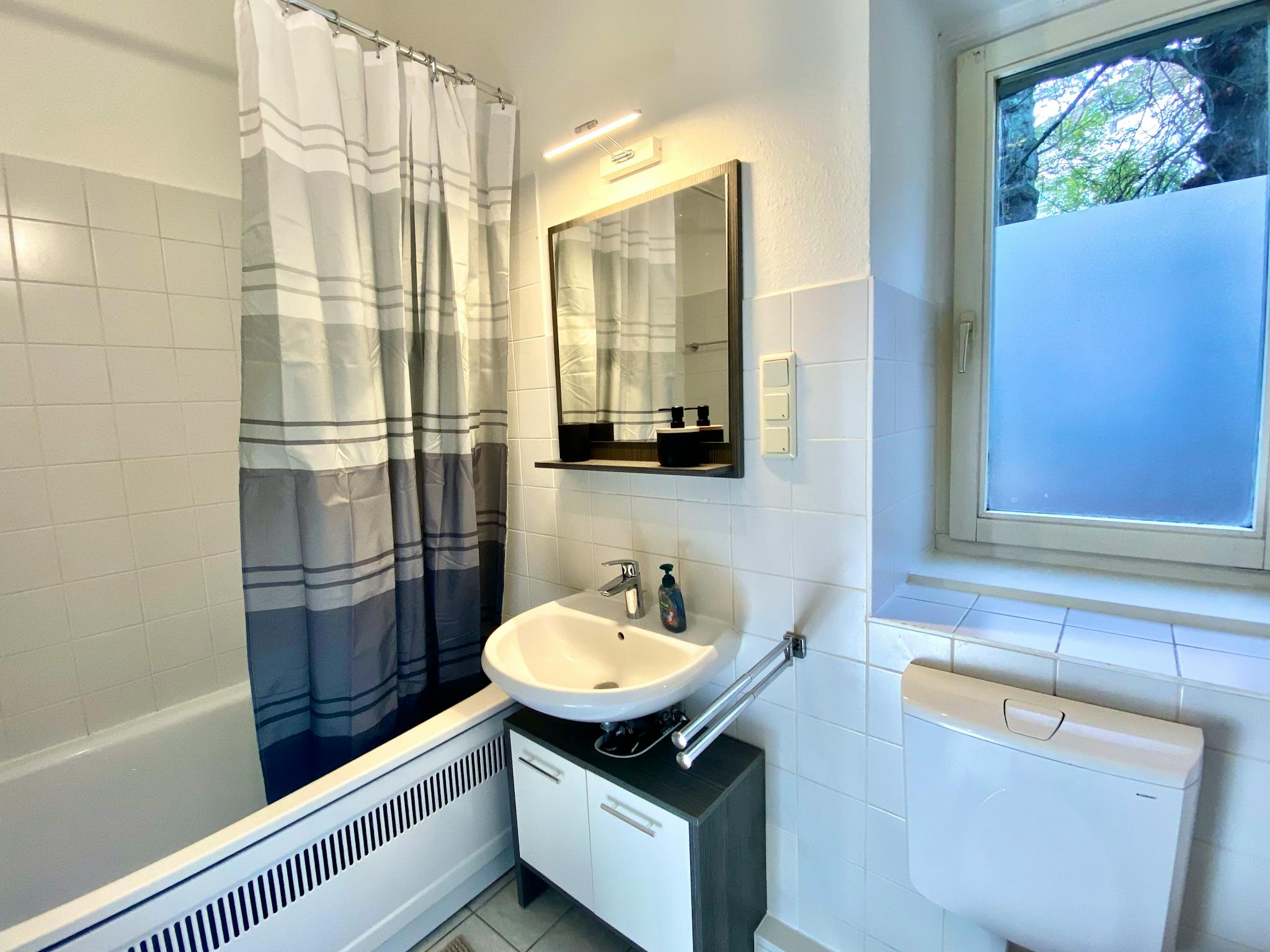 Non-SmokingNot allowedWunderbare und komplett möblierte 2-Zimmer Wohnung in Berlin-Lichtenberg. Dieses gemütliche, einfach eingerichtete Apartment bietet ein großes und ein kleines Schlafzimmer. Das große Schlafzimmer verfügt über einen Fernseher und eine kSchlafcouch. Im kleinen Schlafzimmer steht zudem ein großer Schrank. Die voll ausgestattete Küche hat einen Platz zum gemeinsamen Essen. Außerdem bietet es auch ein vollausgestattetes Badezimmer. Umgeben ist die Wohnung von vielen Parks und Grünflächen.