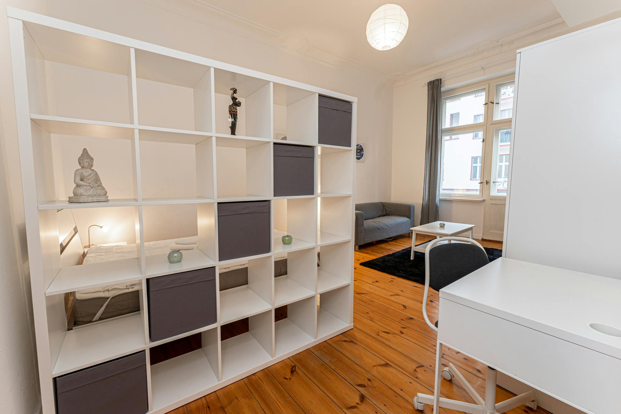 This enchanting 1-room apartment in a quiet area of Prenzlauer Berg offers a spacious 44 qm with high ceiling as well as wodden flooring. More central than this location you cannot find! Altough the apartment is located in a quiet side street the public transportation near by so that you can reach any part of Berlin in no time. Spacious kitchen and bathroom for the ultimate feelgood experience. The extras of very strong internet, electricity, heating and water consumption are included in the monthly rent - no hidden or additional costs.