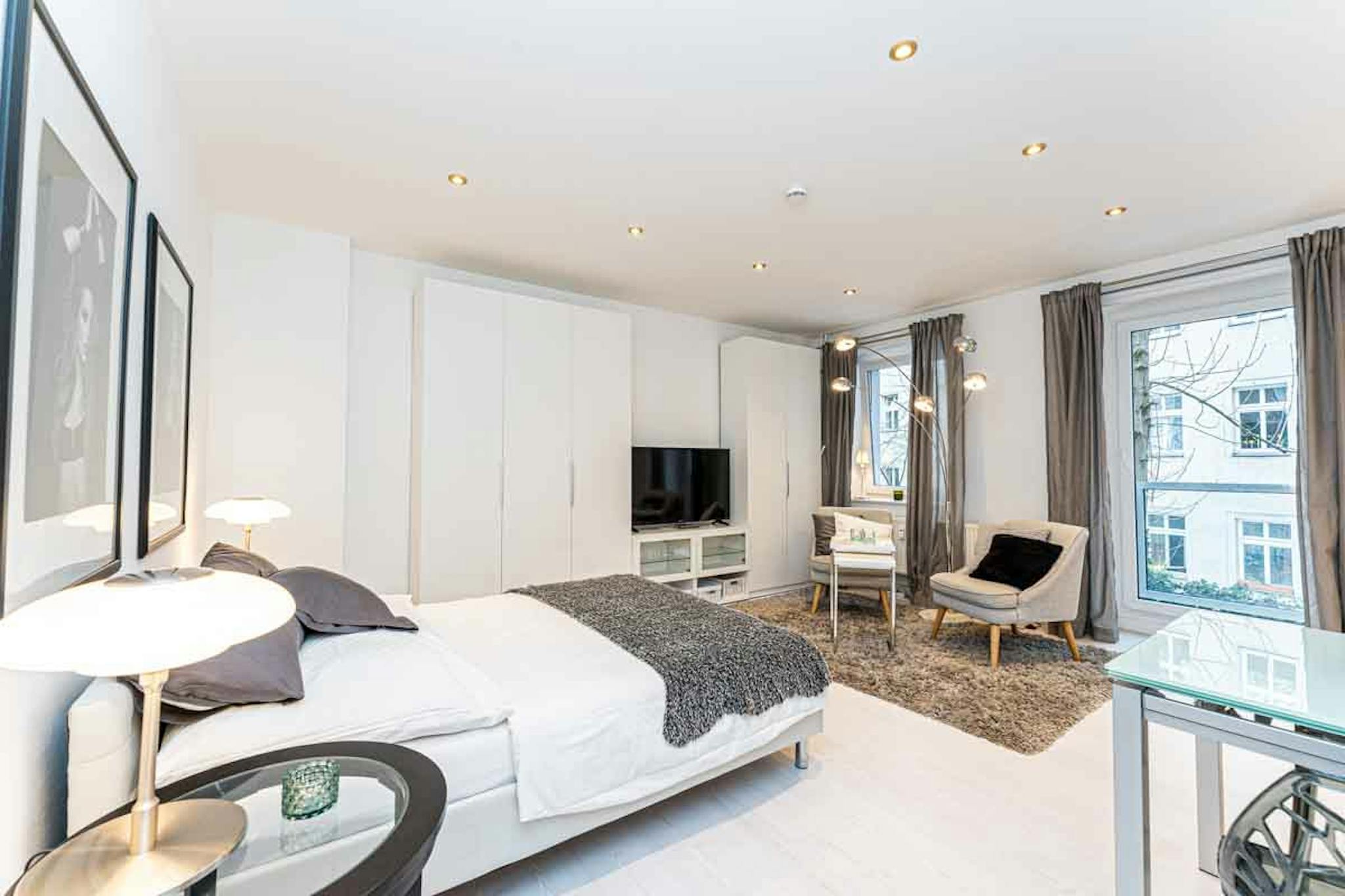 And our apartment: it is in an absolutely quiet location on the 1st floor of the rear building of an old Berlin building with a view of the leafy courtyard. Nevertheless, you are right in the middle of the hustle and bustle. The studio is fully equipped: