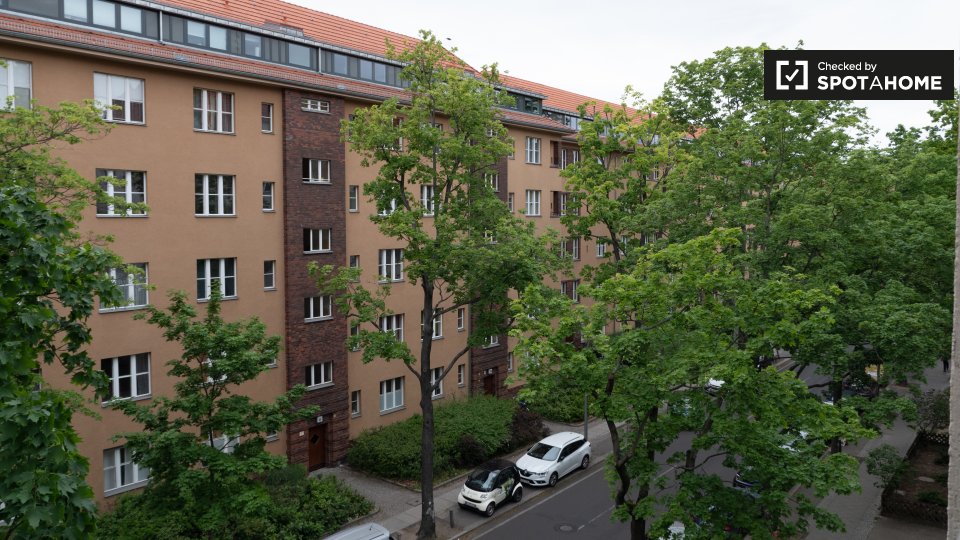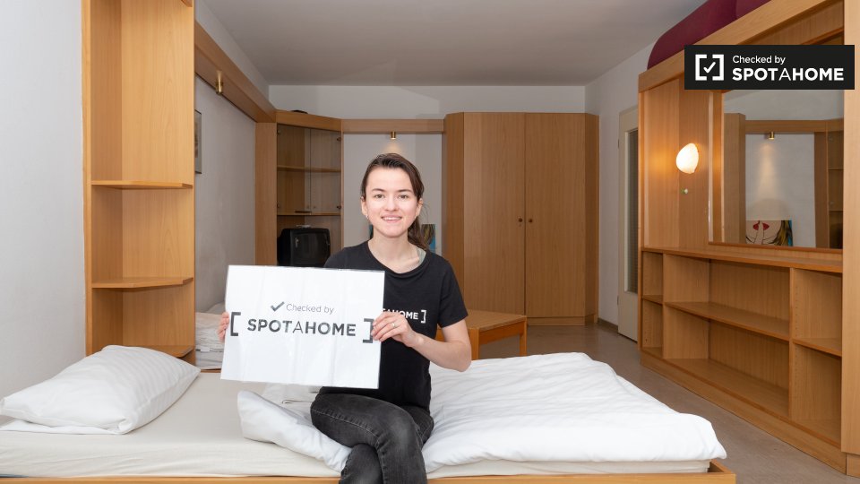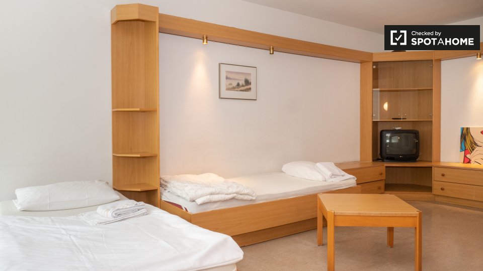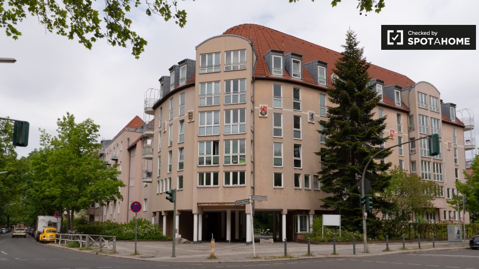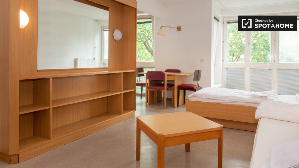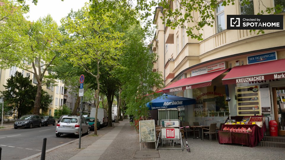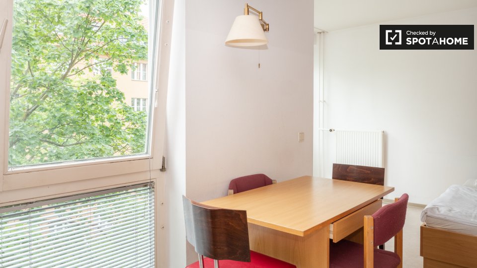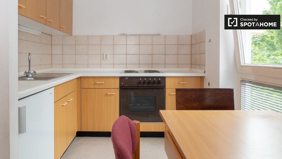 This is a studio apartment on Kreuznacher Straße, Berlin. The sun-filled studio has plenty of storage and a fully equipped kitchen.