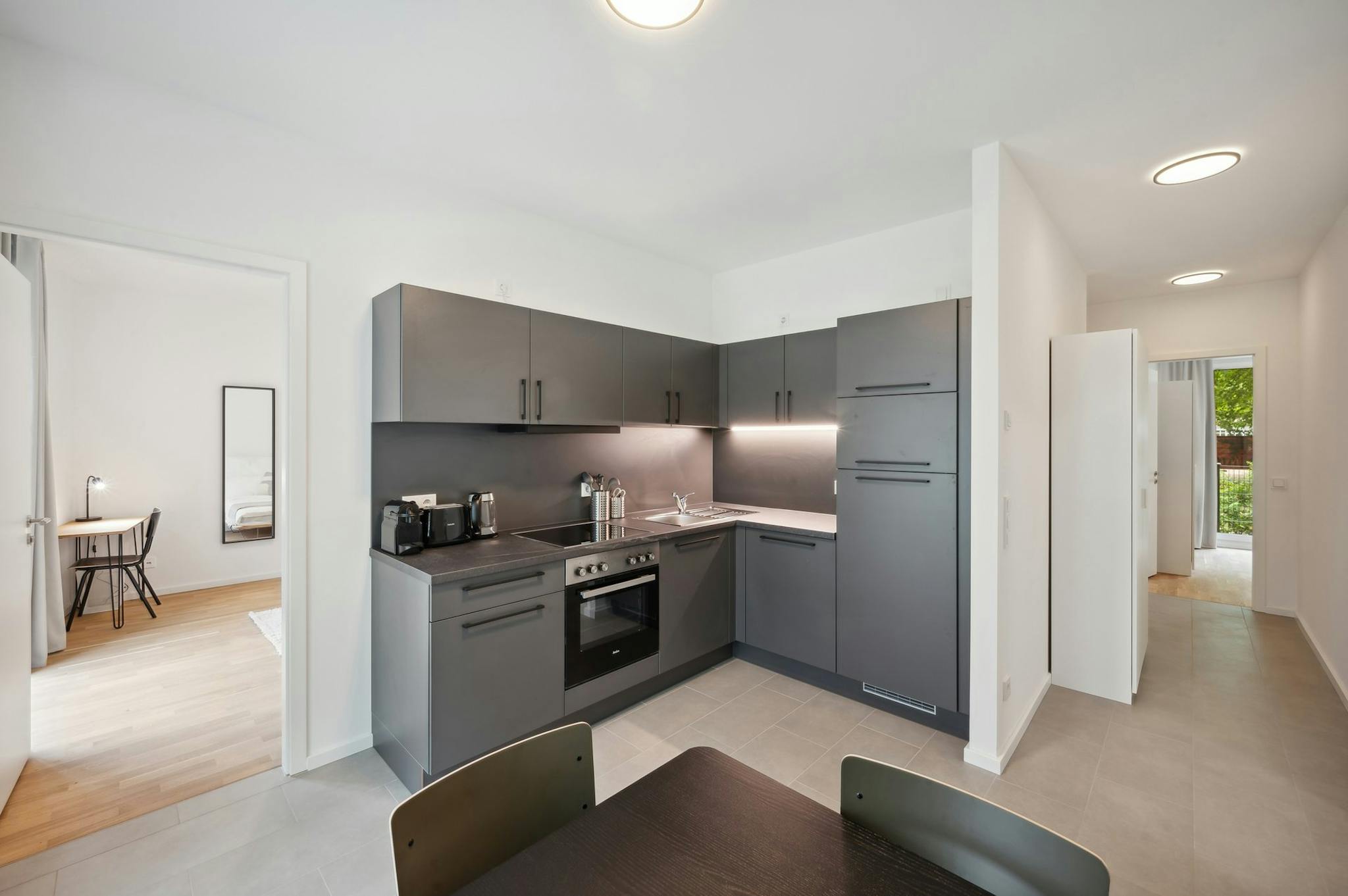 Our two newly built buildings surrounded by a green courtyard create a safe secluded space for you to find peace in the midst of Berlins city life. The property is purposefully built to be an ideal location for you to enjoy the co-living lifestyle, and be part of the (hidden) community. There are two community spaces - one in each of the buildings. Both of them feature fully equipped kitchens with cooking islands and lounge areas with sofas, armchairs, coffee tables, and a TV. You can spend time cooking meals together with your flatmates here or relax watching a new show. In alignment with our sustainability efforts, both buildings are illuminated with energy-efficient LED lights.