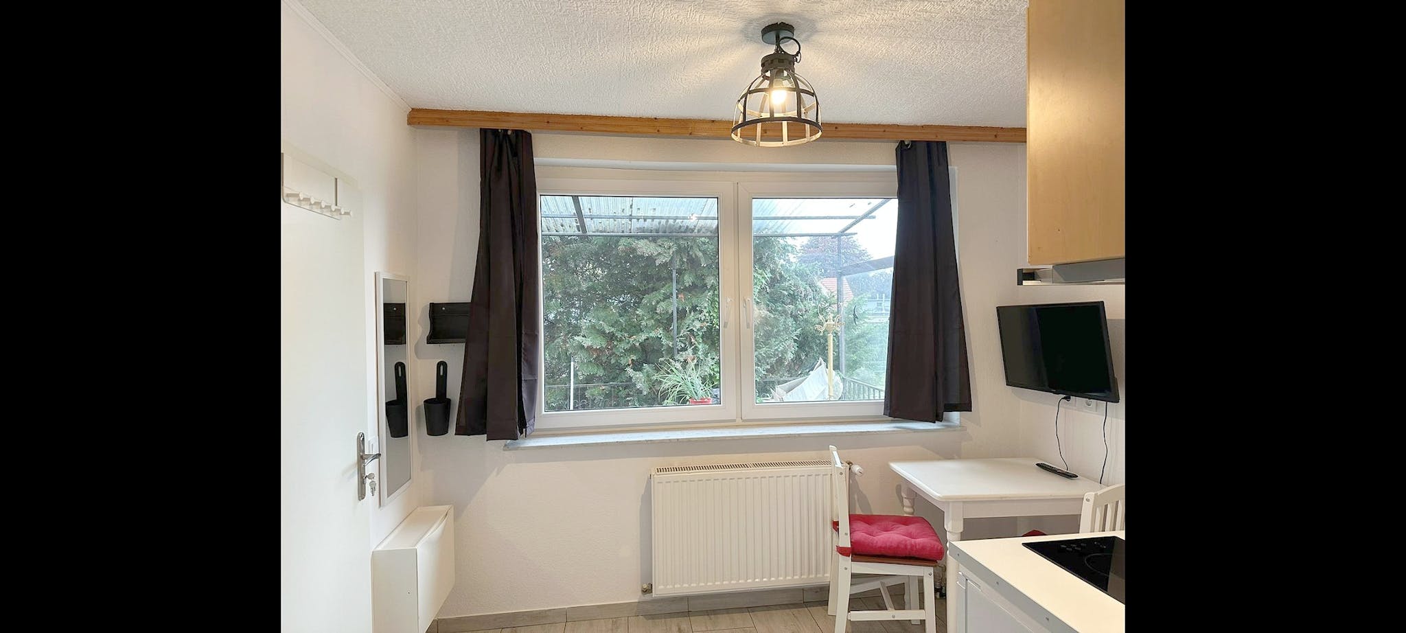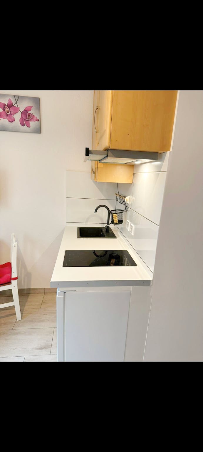 I rent out a studio (own room with integrated kitchenette and own private bathroom with mini bath) with wifi with extra common room. It is a first occupancy after extensive renovation. In the common room is the washing machine and a wooden seating area.