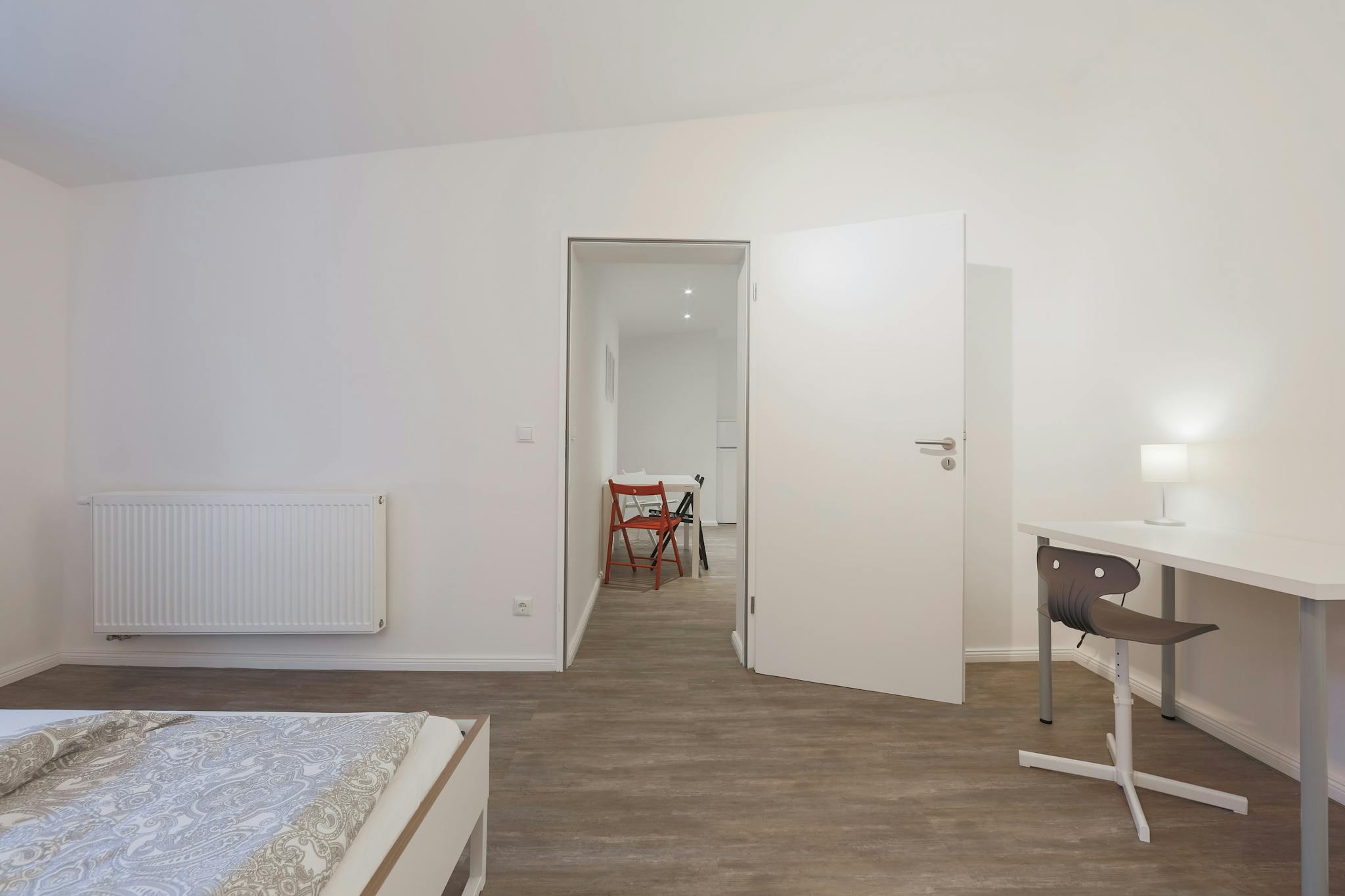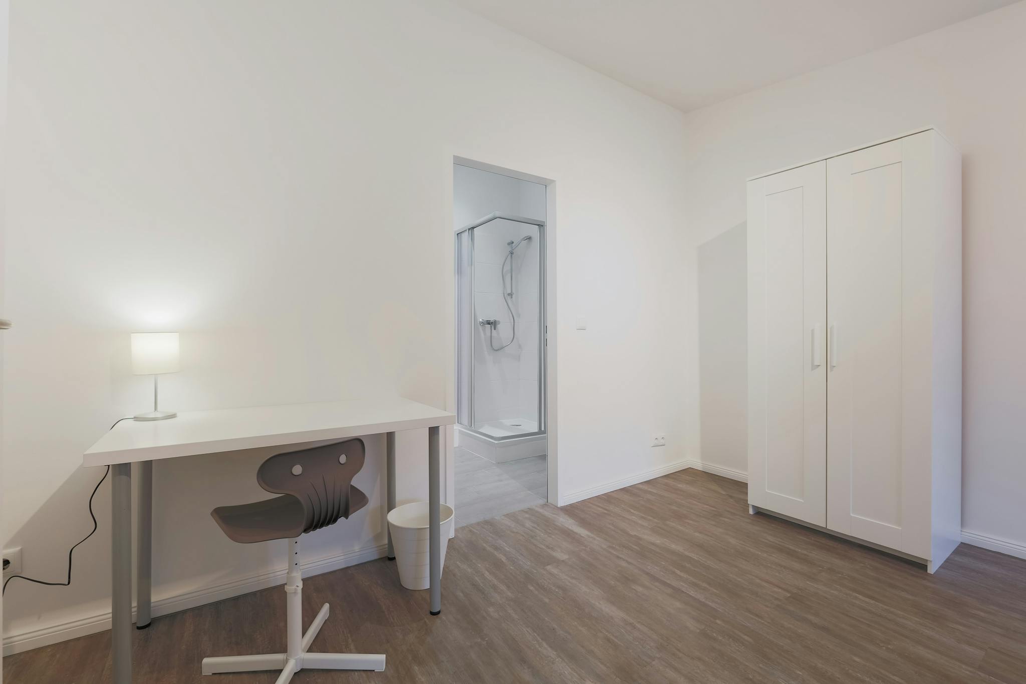 Fully furnished with a comfy bed, desk, chair, and wardrobe.