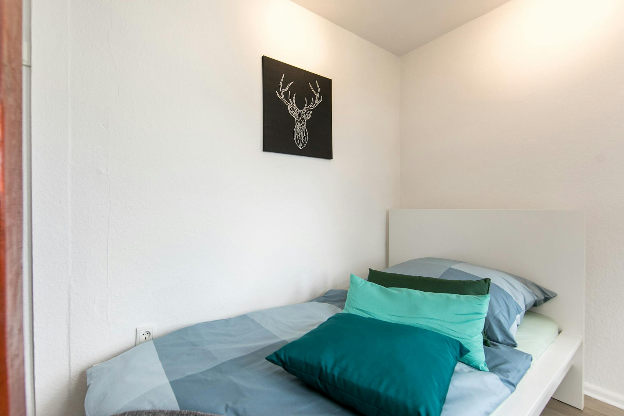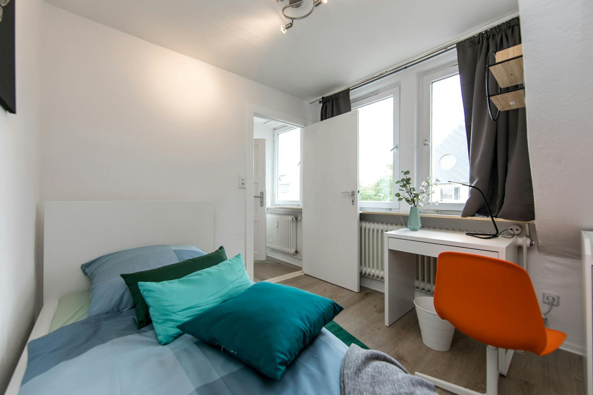 this is a fully furnished room in a shared flat in your own house with garden. The room has a comfortable bed, a desk with chair and a wardrobe for your clothes. Also the common areas are fully equipped with washing machine, cooking equipment and all you need for your daily living.