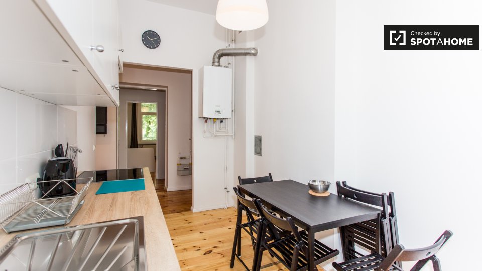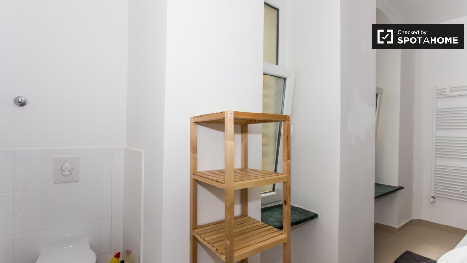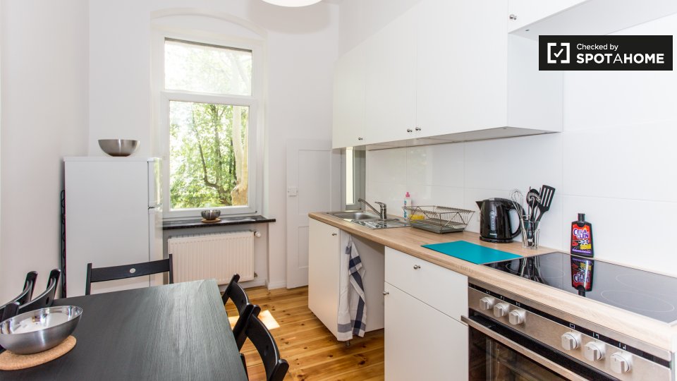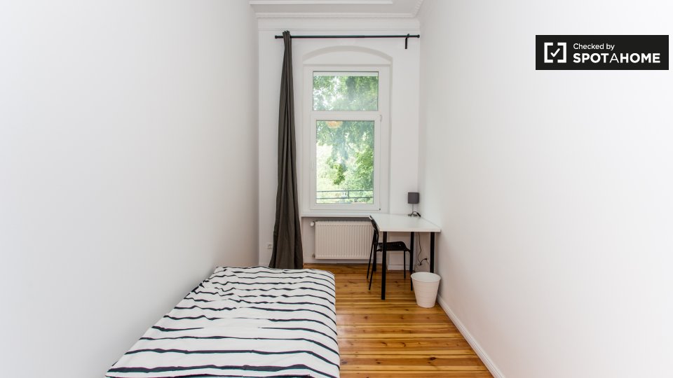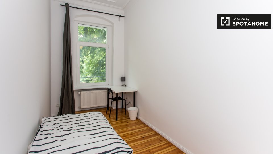 Pets not allowedNot allowedLocated in Berlin, this room in a shared 6-bedroom apartment makes an excellent choice for students. The apartment is fully furnished and equipped, ensuring a comfortable living experience. It includes a central heating system and has a private washing machine, offering convenience and practicality. With an exterior room layout, ample natural light can be enjoyed. All essential bills such as electricity, water, gas, and Wi-Fi are included in the rental price, providing stress-free living.