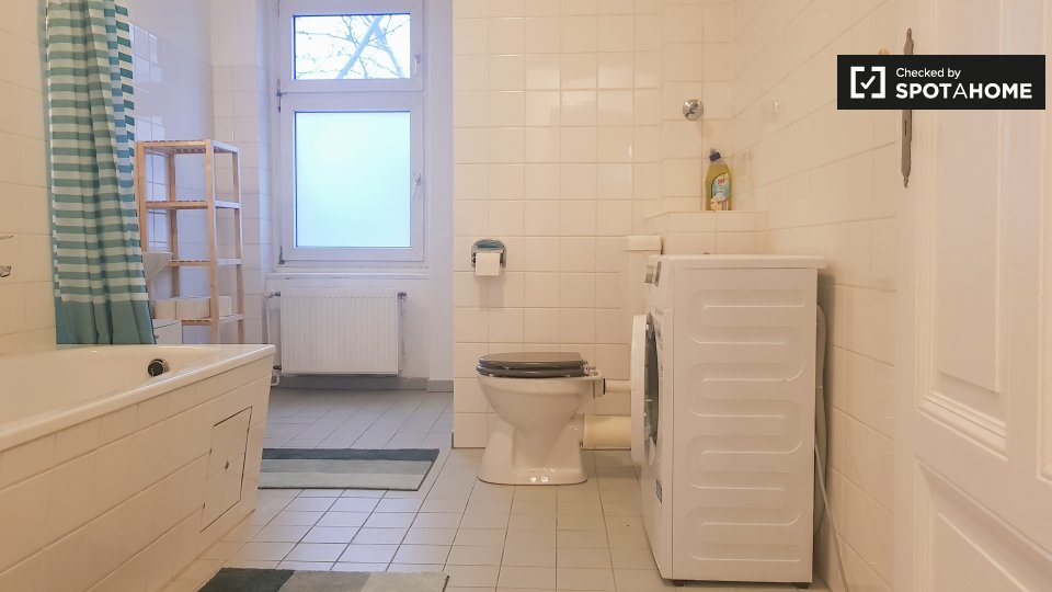 This is a modern 3rd floor, 4-bedroom apartment on Haubachstraße, Berlin. It's got a superb kitchen with an intimate dining area, and a huge bathroom with a bathtub.