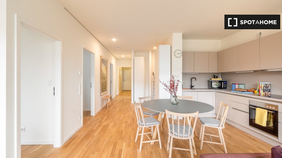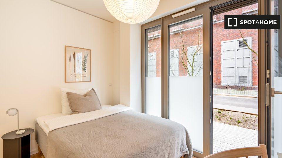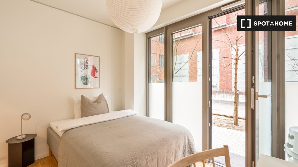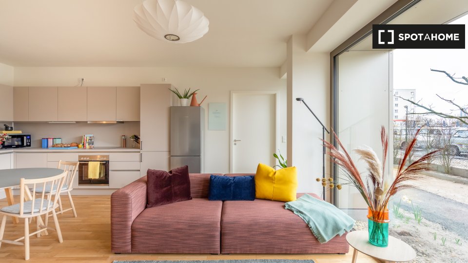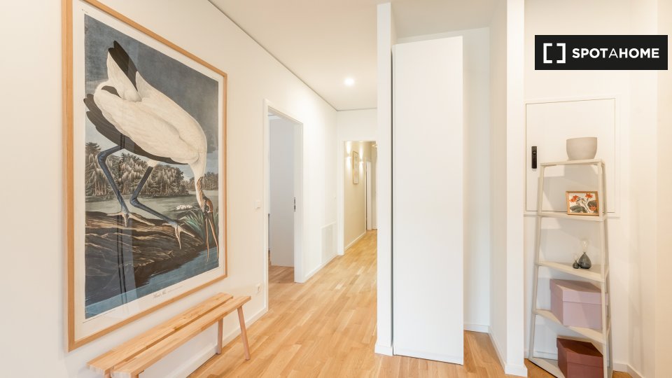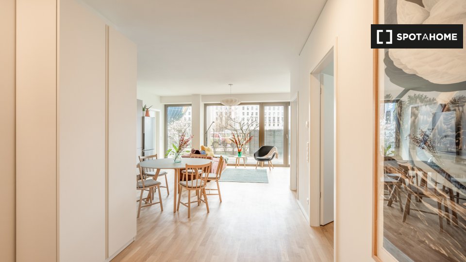 The flat is a ground floor apartment with 5 spacious and brightly lid bedrooms. It features a private patio, front and back courtyard as well as a beautiful shared rooftop terrace with a breathtaking view of Berlin.