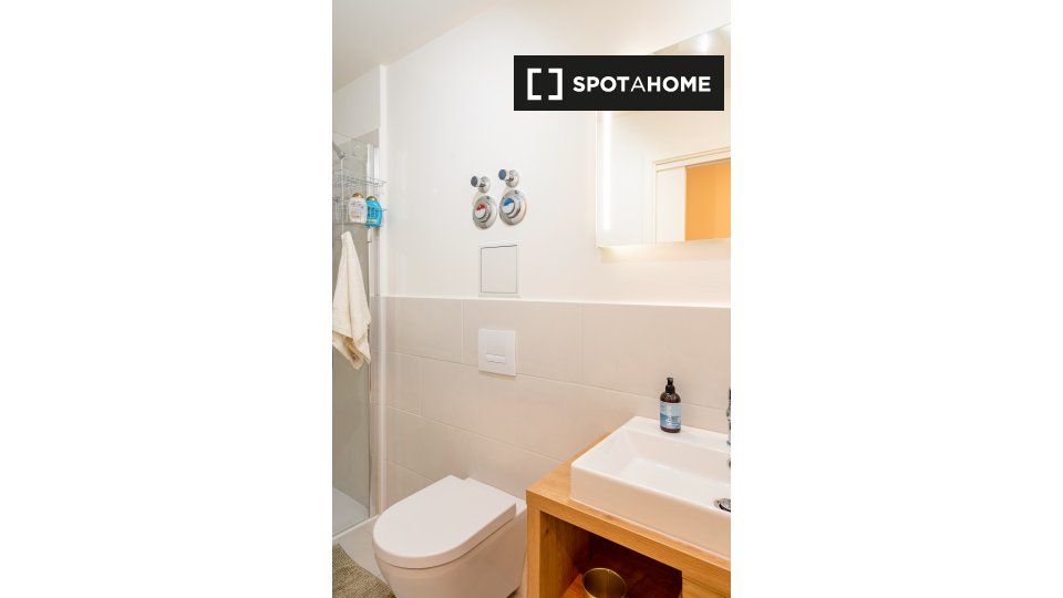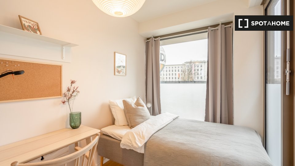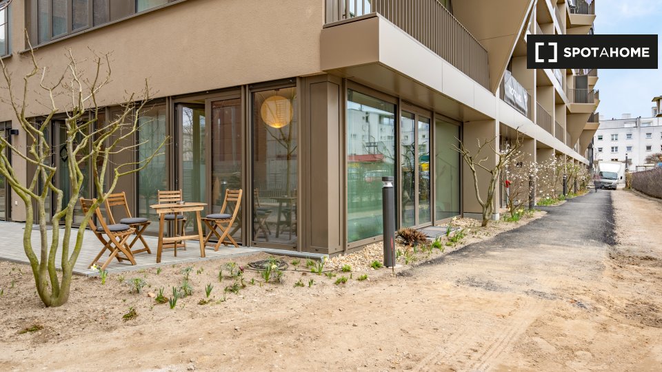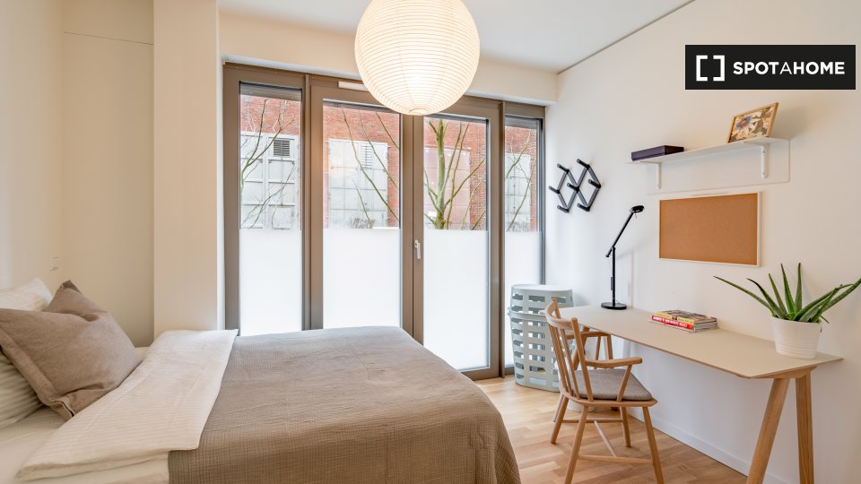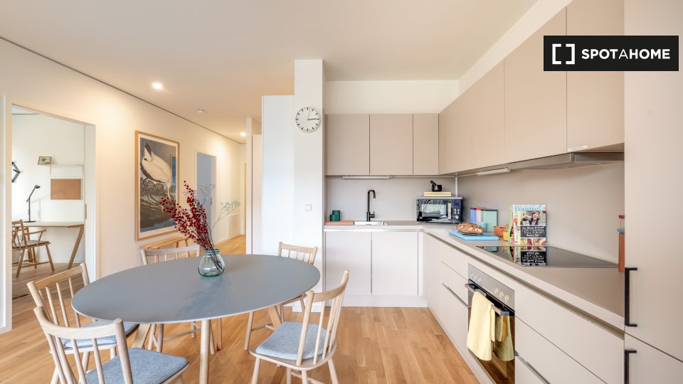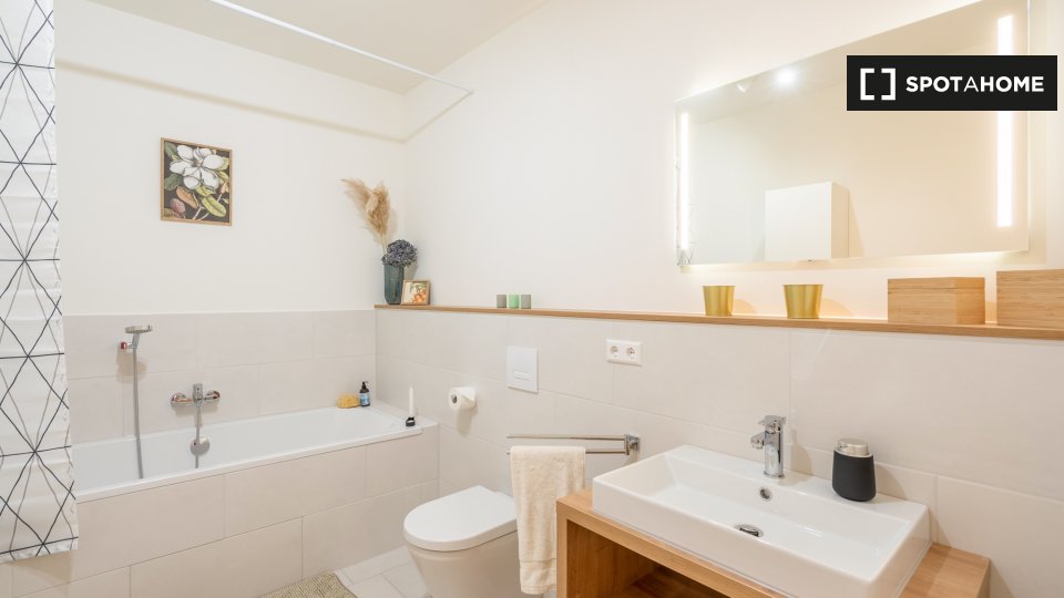 The flat is a ground floor apartment with 5 spacious and brightly lid bedrooms. It features a private patio, front and back courtyard as well as a beautiful shared rooftop terrace with a breathtaking view of Berlin.