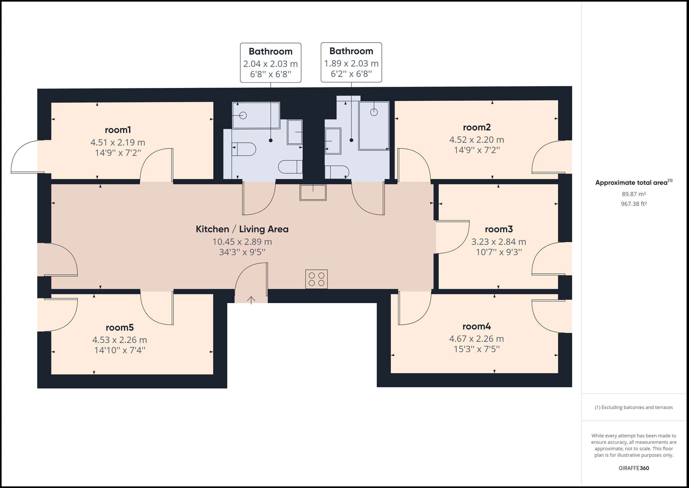The flat is a 5-room flat-share with a shared kitchen and two bathrooms.