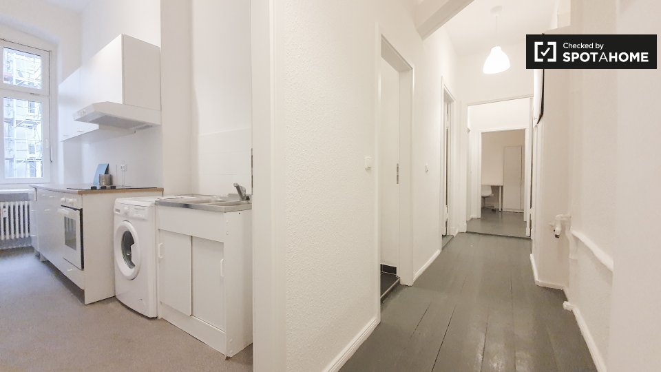 This is a minimalist 1st floor, 3-bedroom apartment on Kottbusser Damm, Berlin. It boasts a fully-equipped kitchen with a cosy dining area, and modern bedrooms with storage and their own desks.