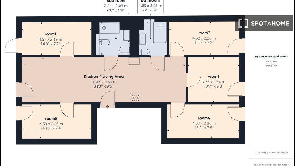 The flat is a 5-room flat-share with a shared kitchen and two bathrooms.