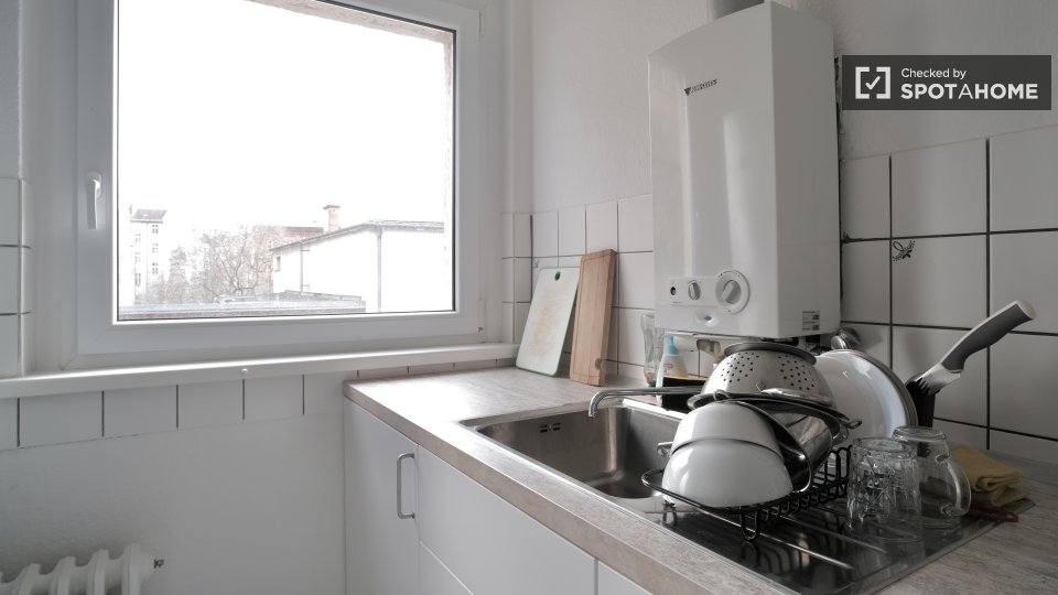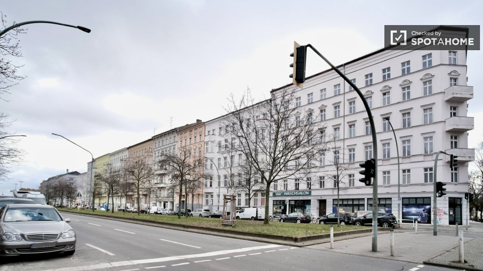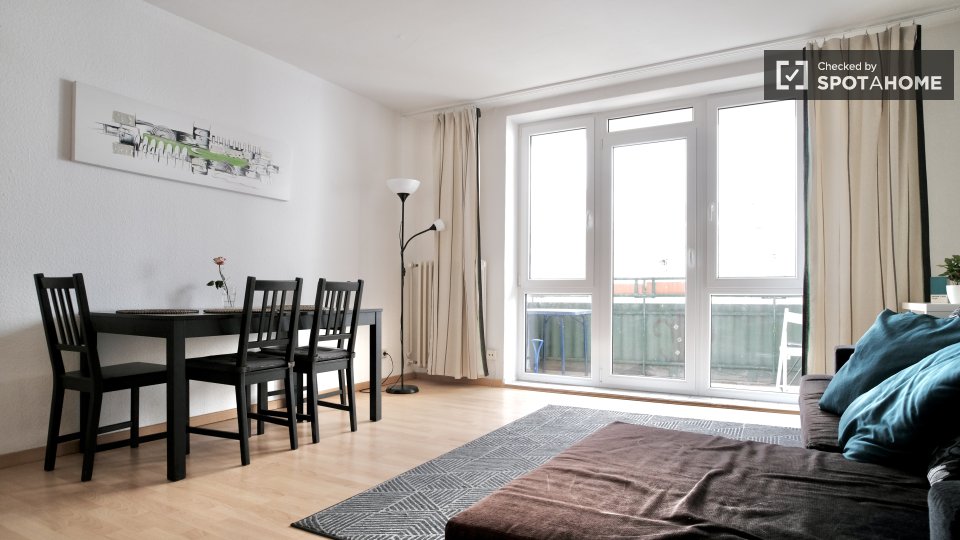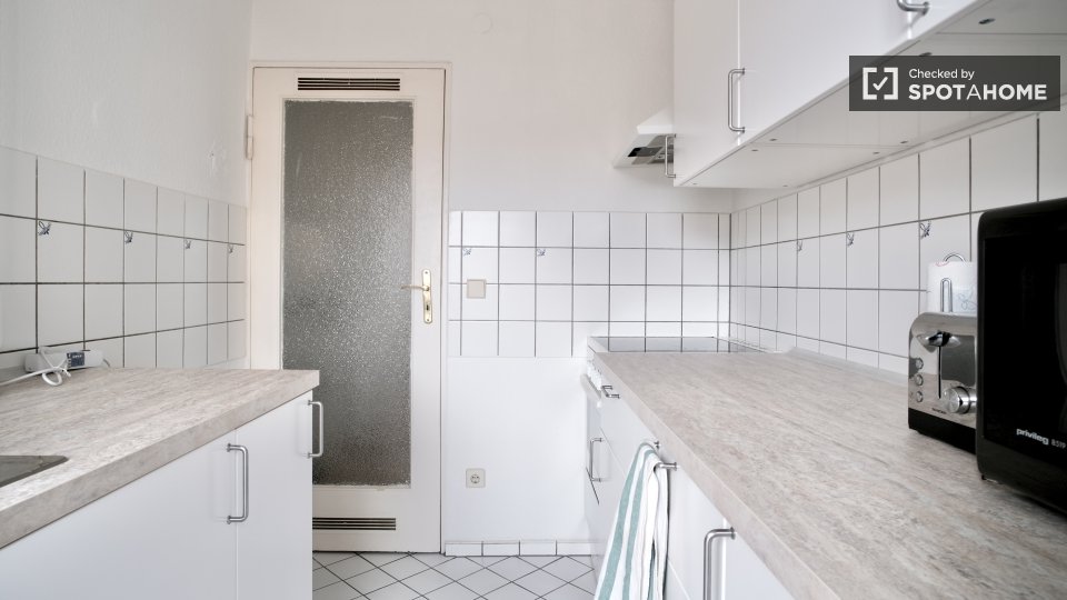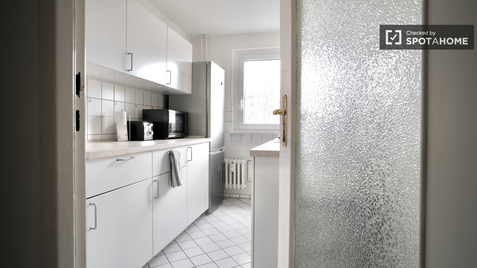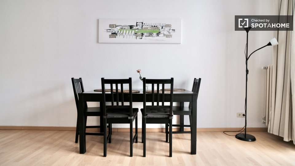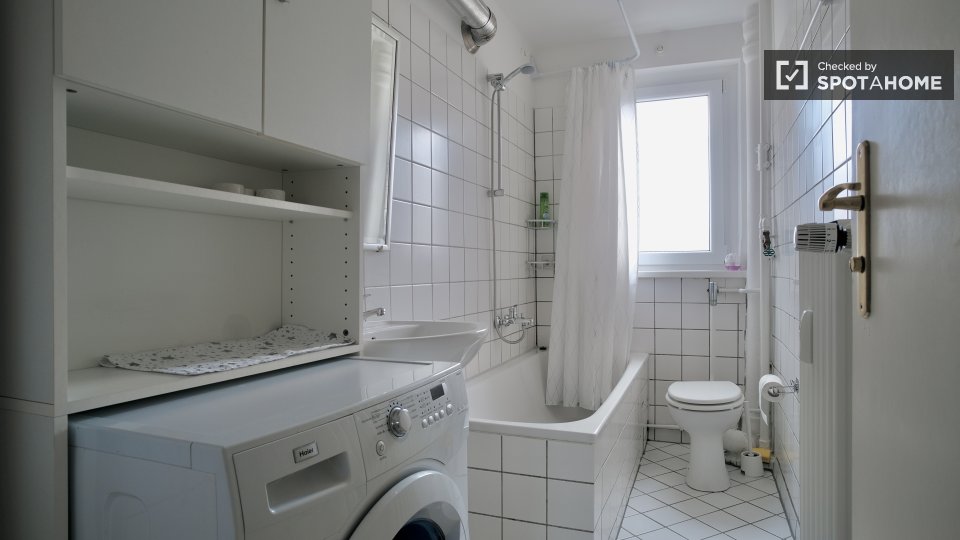 Pets not allowedNot allowedThis 61 m², 2-bedroom shared apartment is available for rent in Tempelhof-Schöneberg, Berlin. There is a large living room with a sofa and a dining table and chairs, and it also opens up onto a small private balcony with outdoor seating. There is a fully-equipped kitchen with an electric stove, a dishwasher, a microwave, and an oven. There are 2 bedrooms, one with a double bed and one with a single bed, but both have a desk and a standalone wardrobe. The shared bathroom has a toilet, sink, and bath.