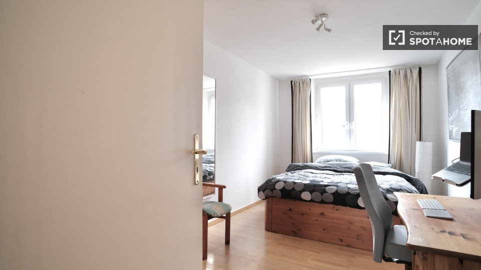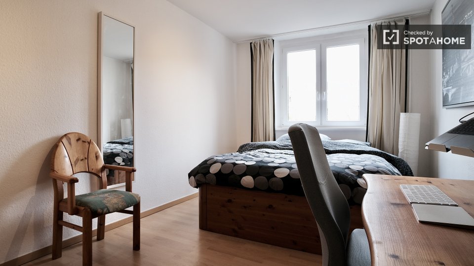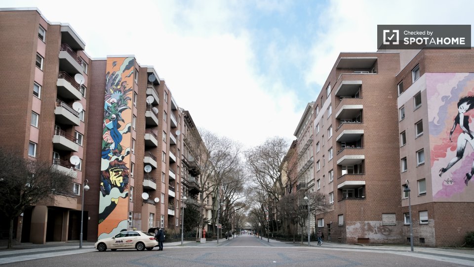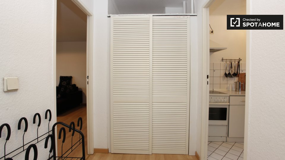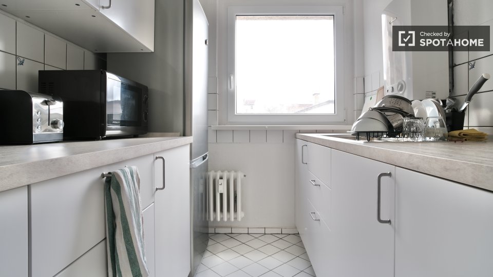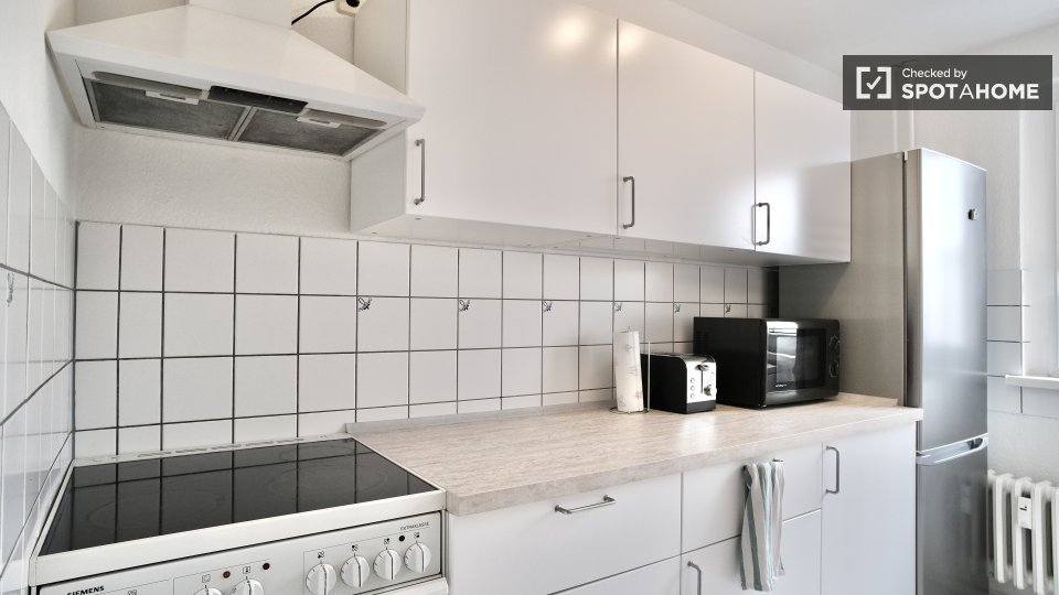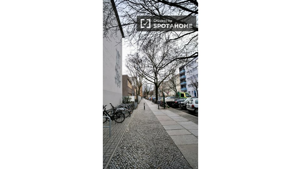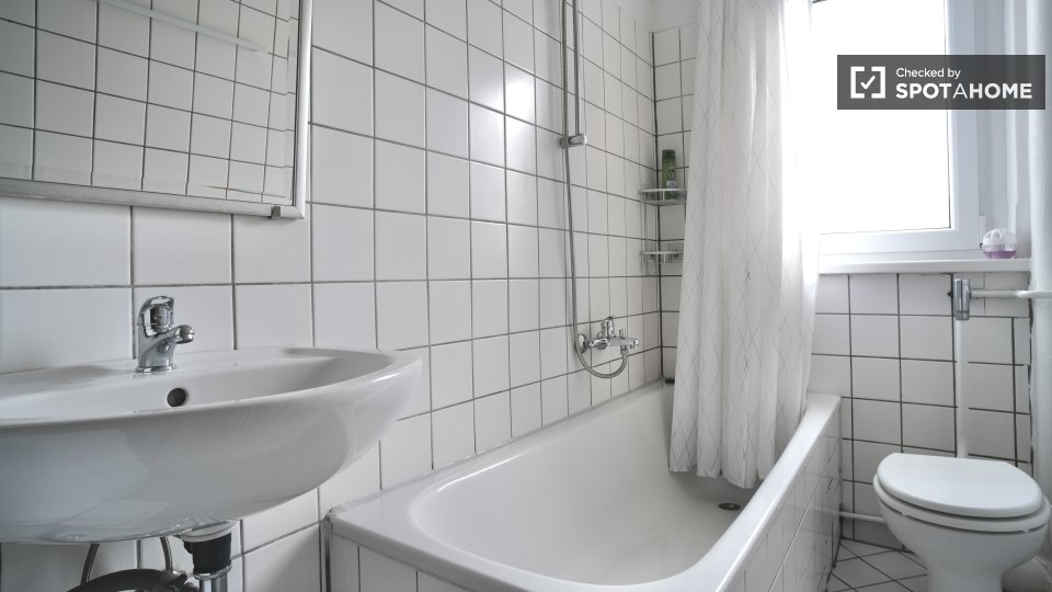 Pets not allowedNot allowedThis 61 m², 2-bedroom shared apartment is available for rent in Tempelhof-Schöneberg, Berlin. There is a large living room with a sofa and a dining table and chairs, and it also opens up onto a small private balcony with outdoor seating. There is a fully-equipped kitchen with an electric stove, a dishwasher, a microwave, and an oven. There are 2 bedrooms, one with a double bed and one with a single bed, but both have a desk and a standalone wardrobe. The shared bathroom has a toilet, sink, and bath.