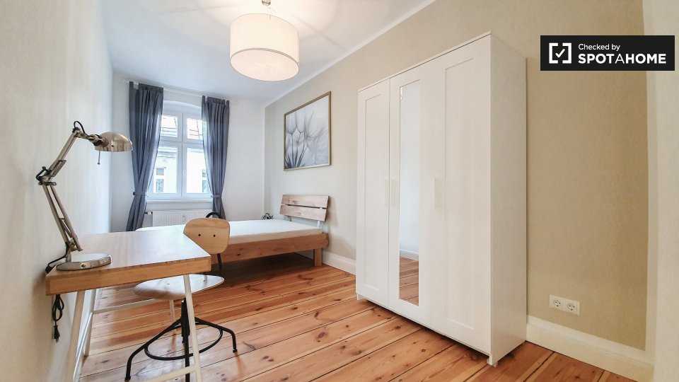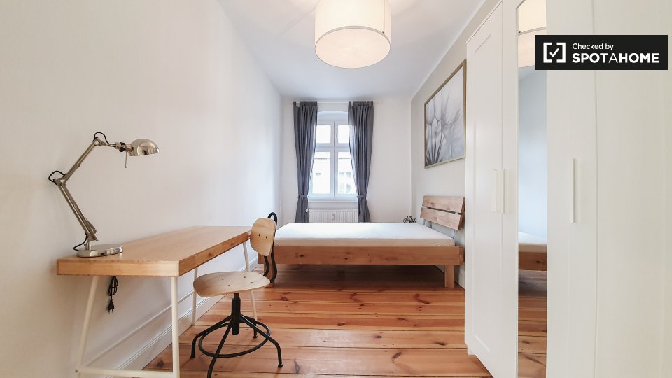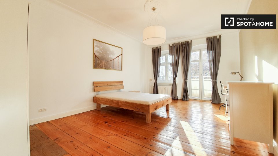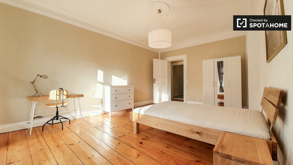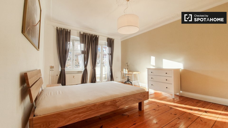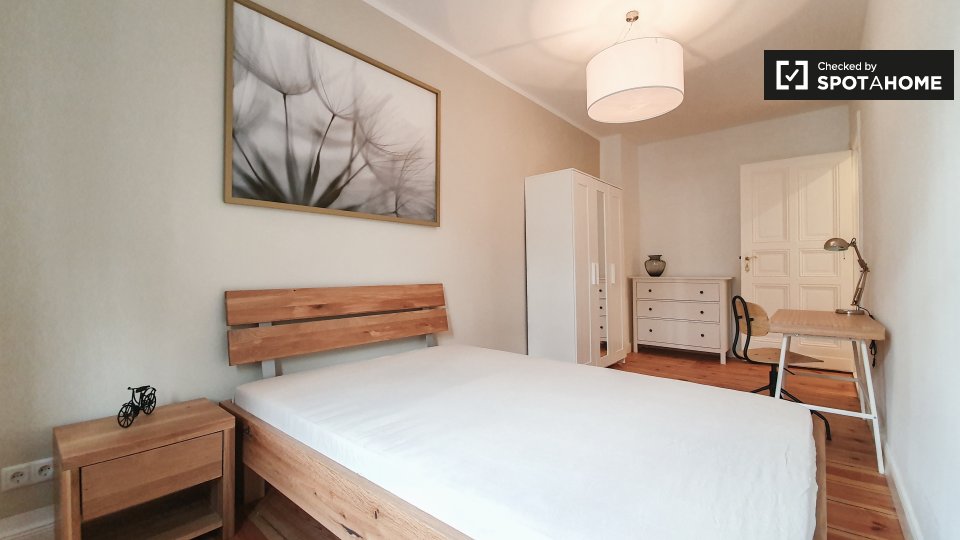 This is a 4th-floor apartment with 2 bedrooms on Krossener Str., Berlin. There are big and bright bedrooms to rent in this stylish and well-decorated apartment.
