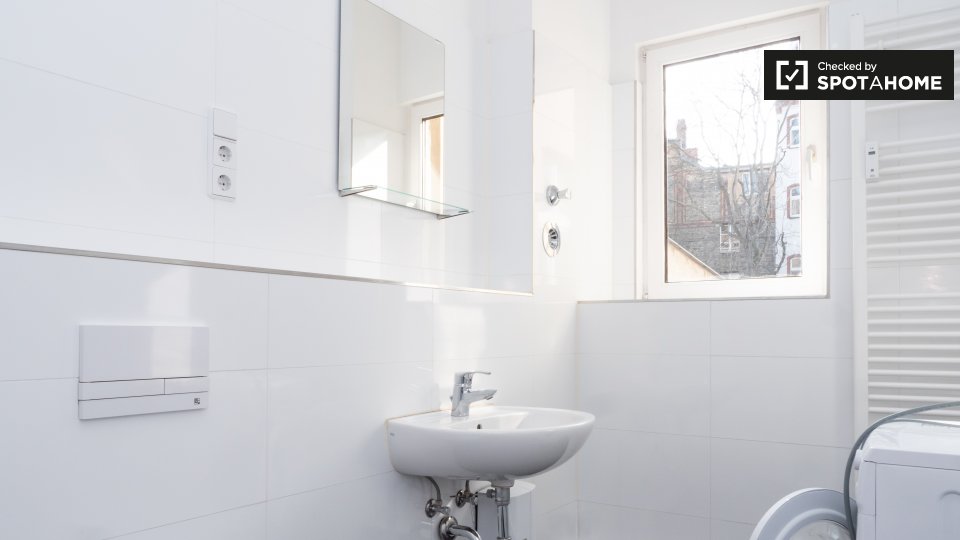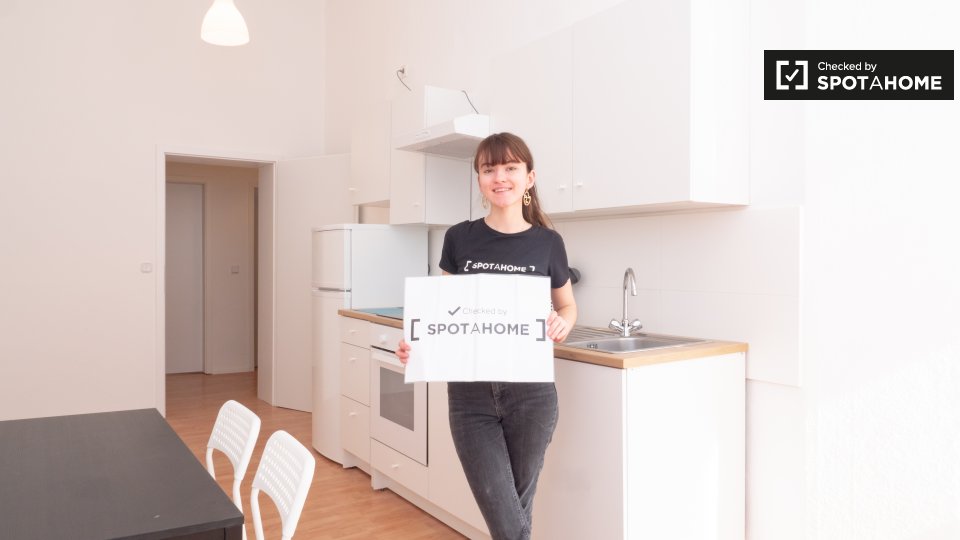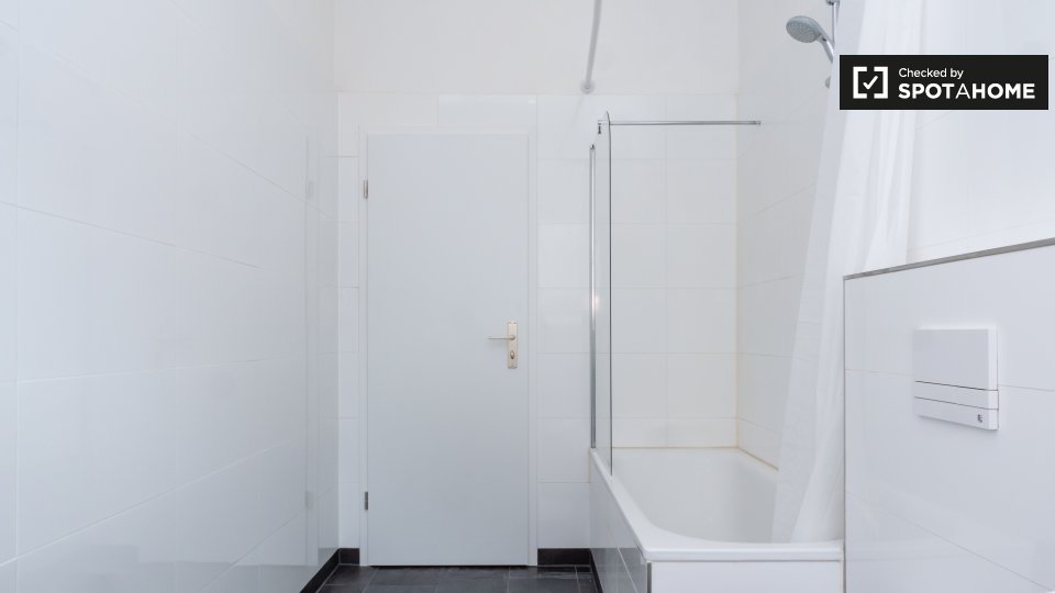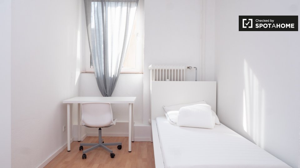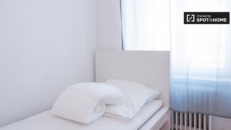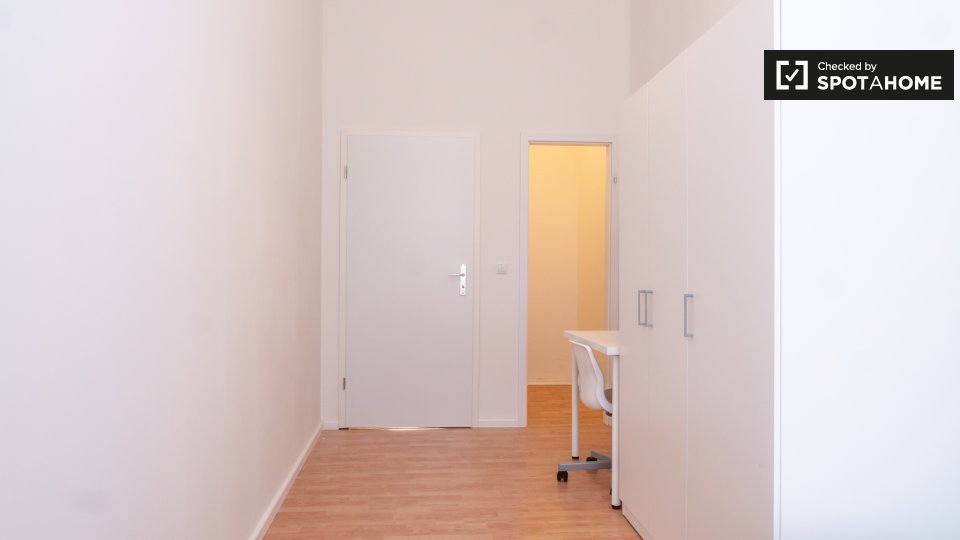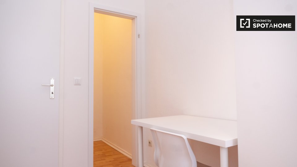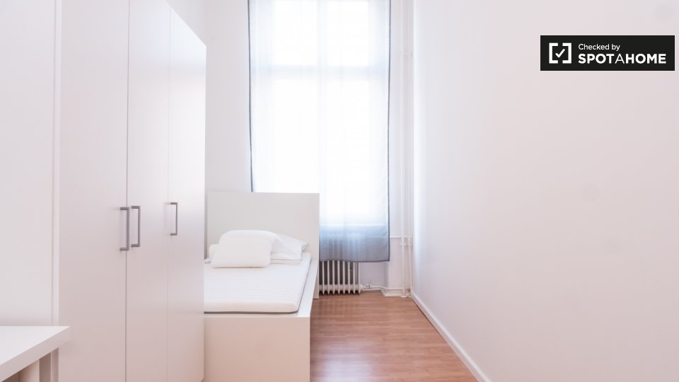 This is a 1st floor, 6-bedroom apartment on Mehringdamm, Berlin. The apartment has sunny and white single bedrooms, all fully furnished.