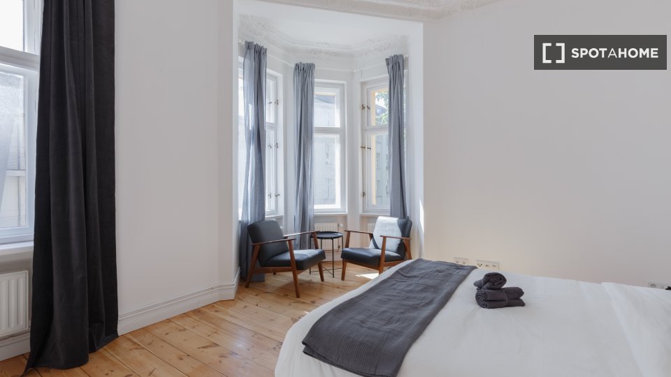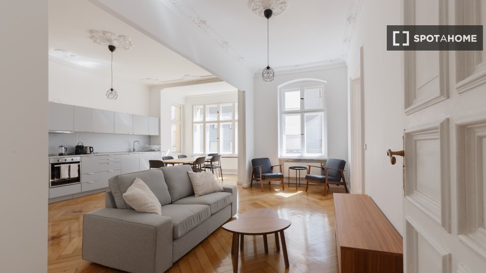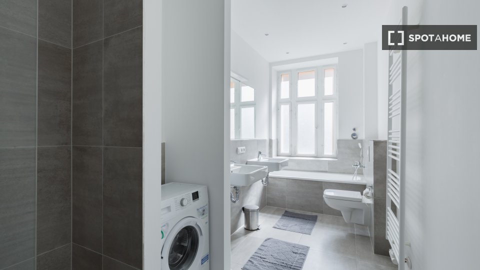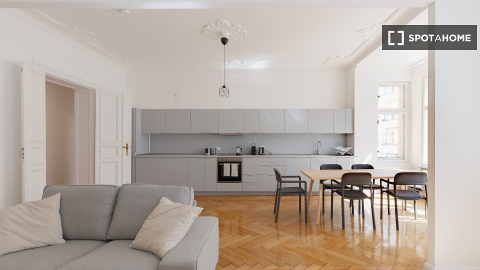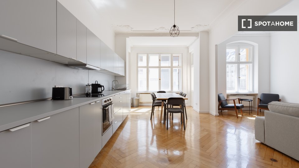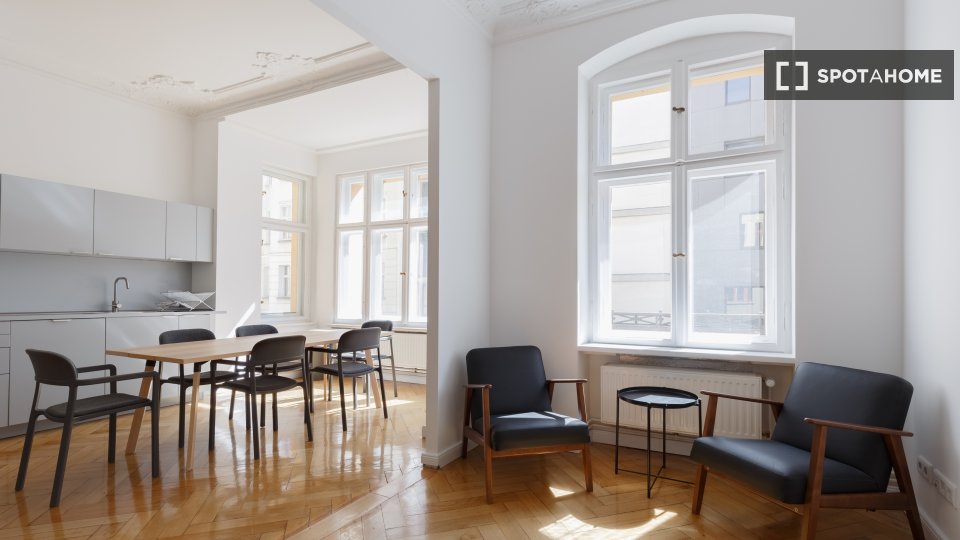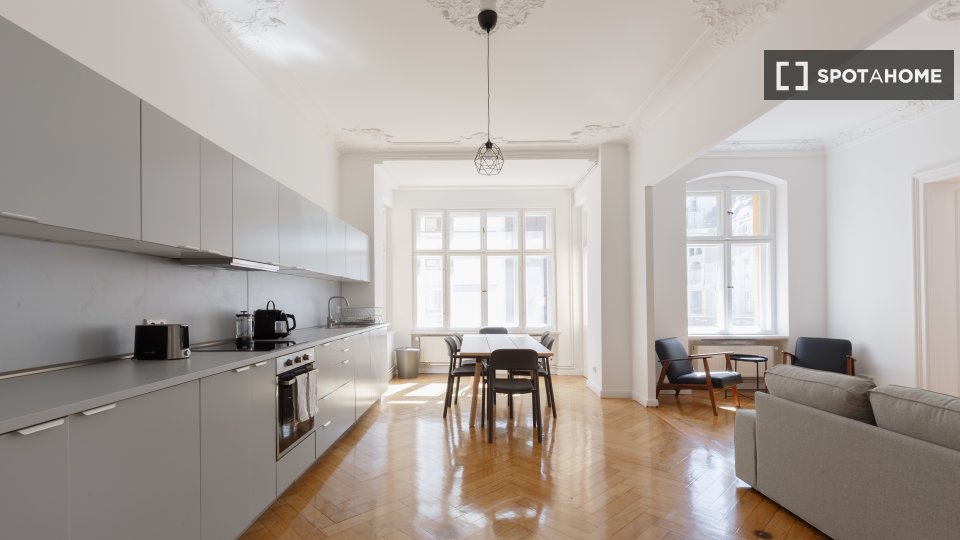 Huge apartment, designed in a modern style with nice furniture, a great kitchen and a small community balcony facing Gormannstraße / Linienstraße. All costs are included in the rent, including bills, internet, and more!