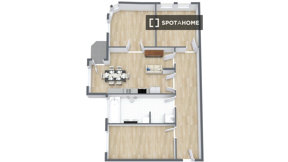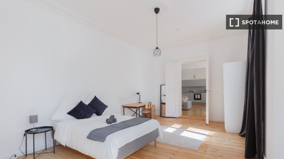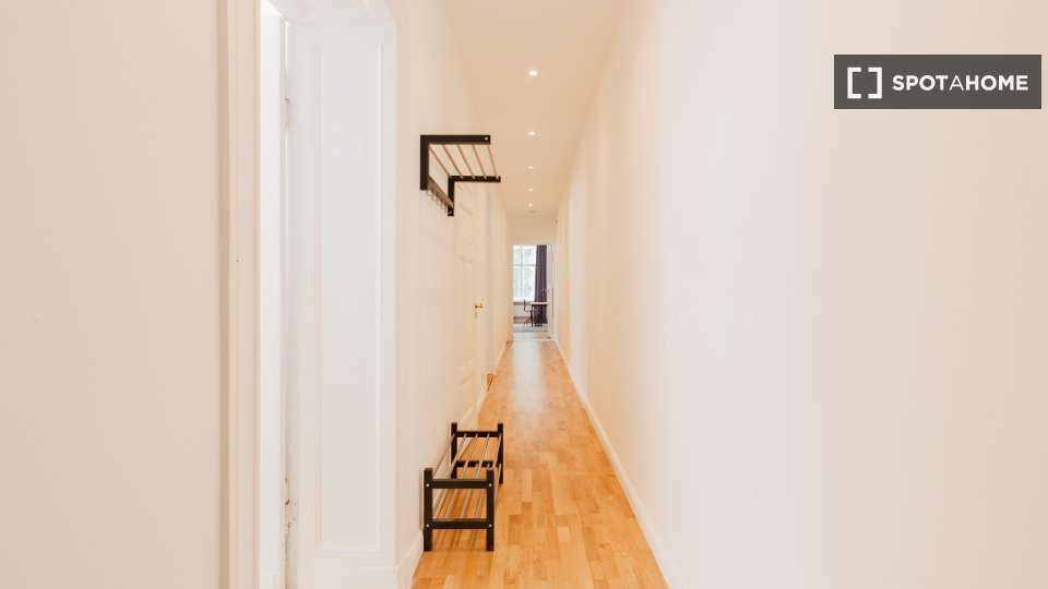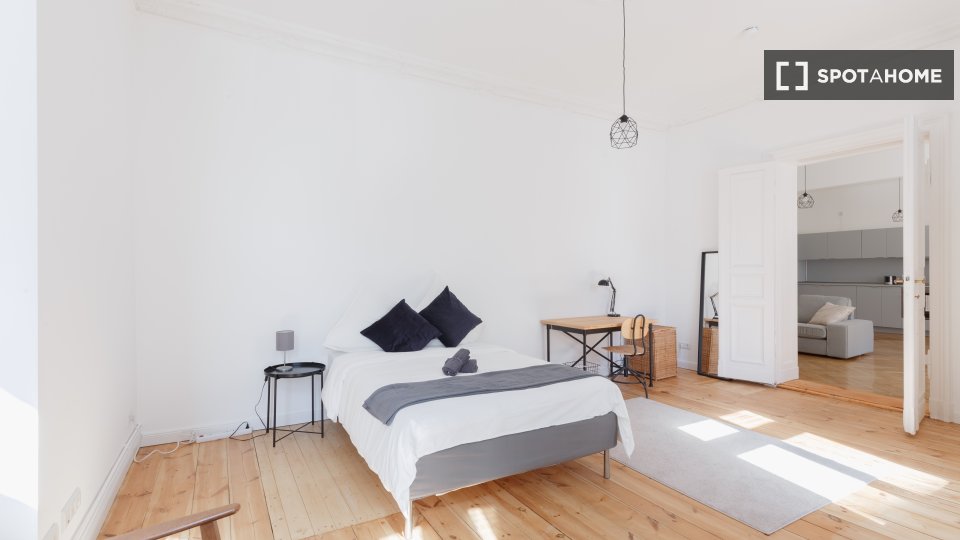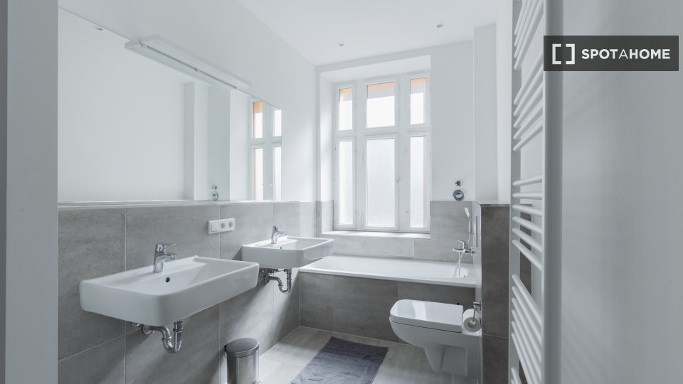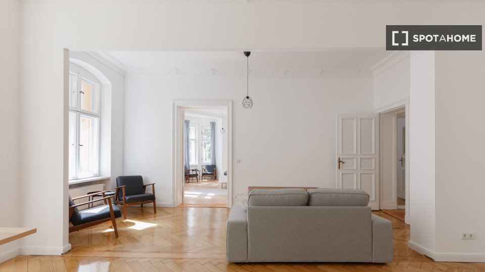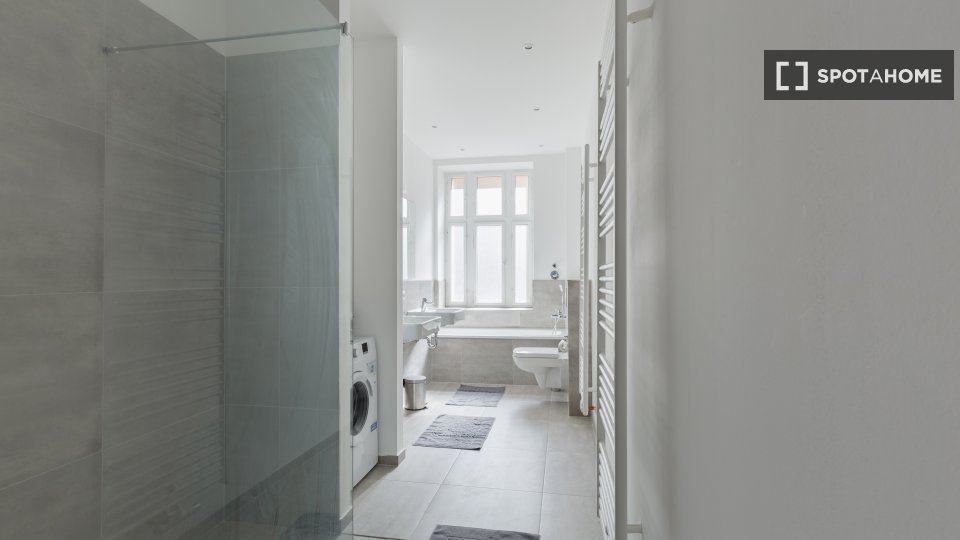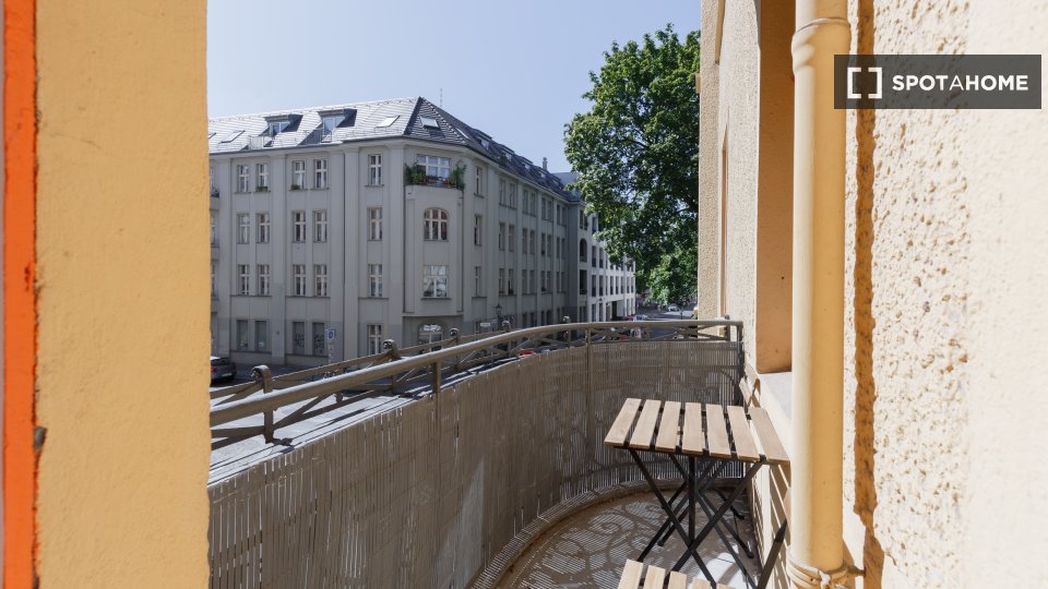 Huge apartment, designed in a modern style with nice furniture, a great kitchen and a small community balcony facing Gormannstraße / Linienstraße. All costs are included in the rent, including bills, internet, and more!