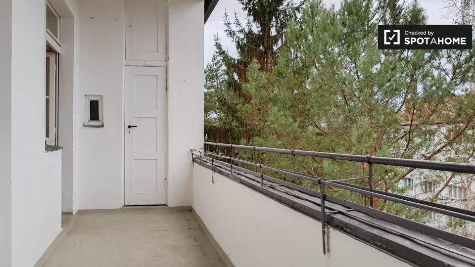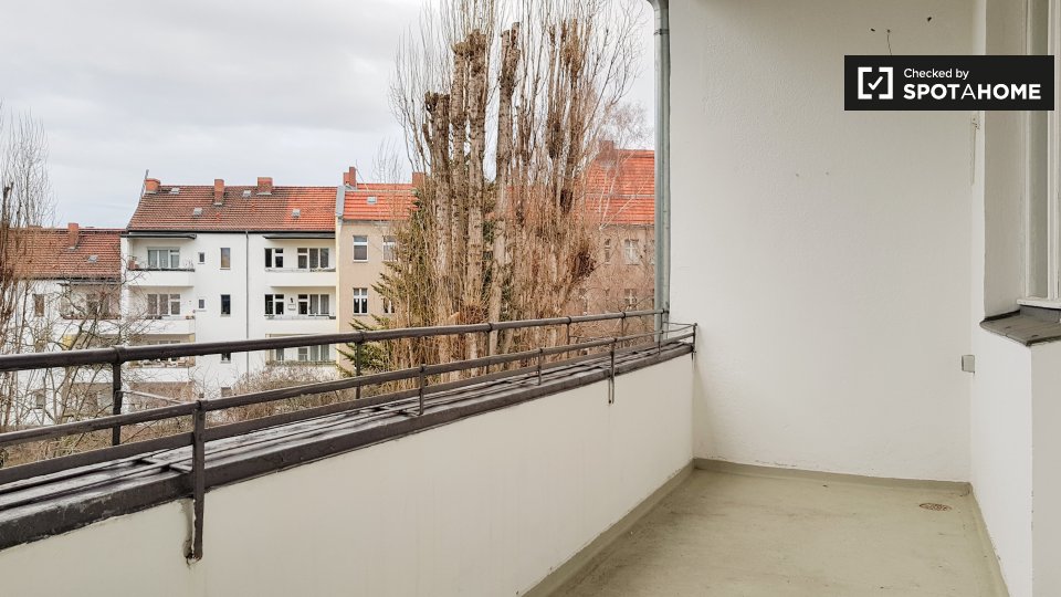 This is a 3th floor, 2-bedroom apartment on Friedrichsbrunner Str., Berlin. It's stylish, it has lots of natural light, and it has a big balcony to enjoy— what's not to like?
