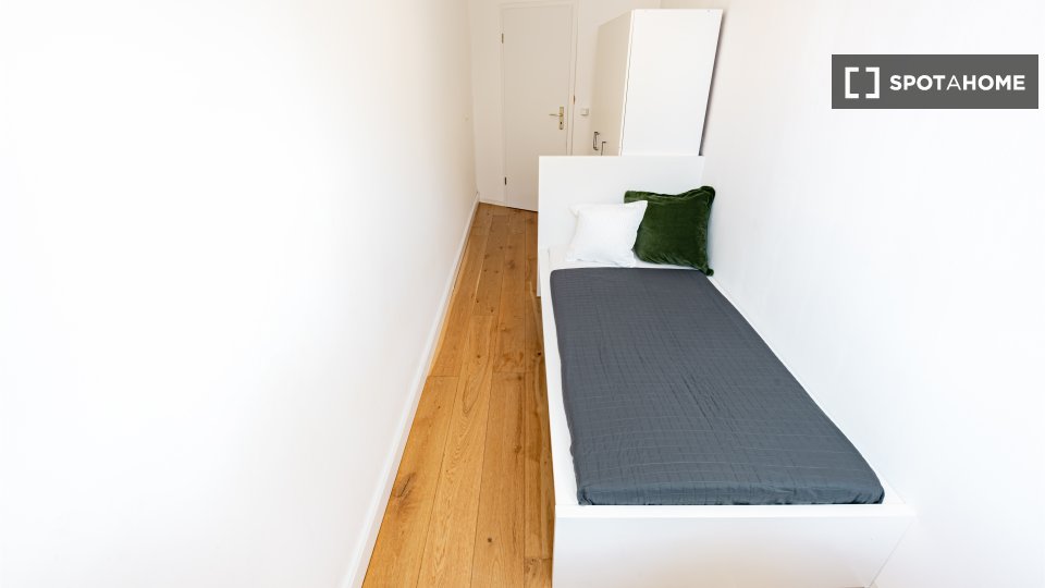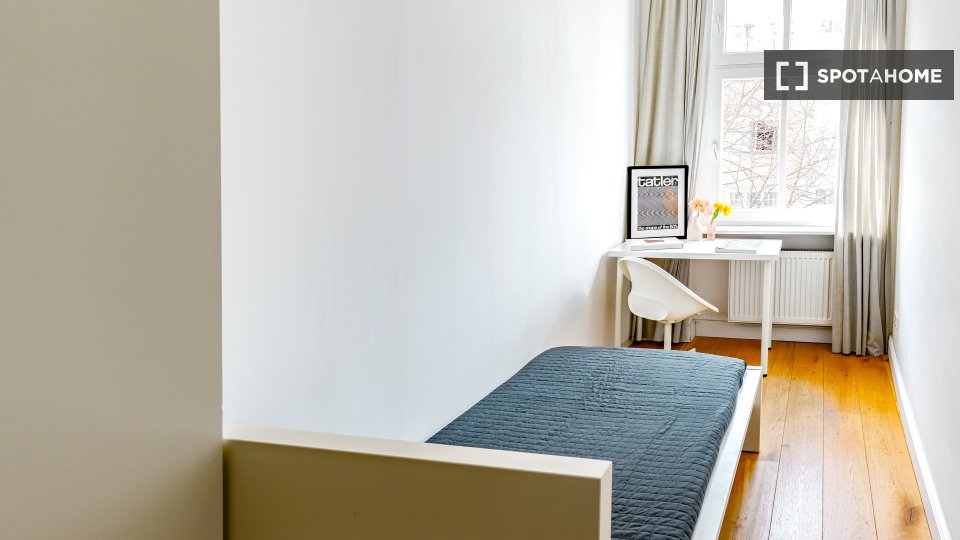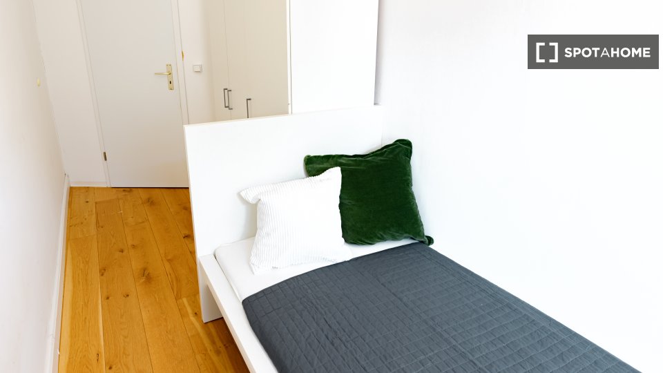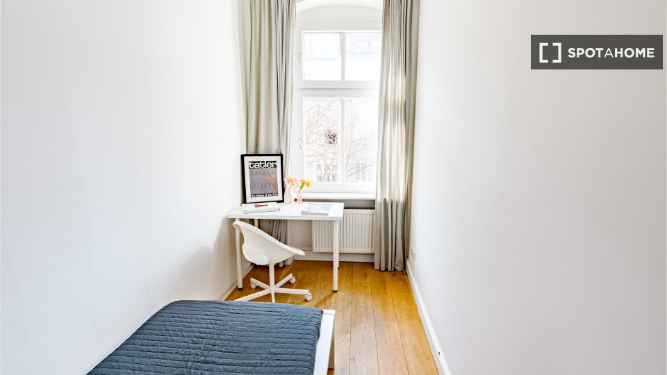 This is a contemporary 3rd floor, 6-bedroom apartment on Schulstraße, Germany. It boasts a minimalist vibe with renovated and spacious rooms, and modern furnishings.