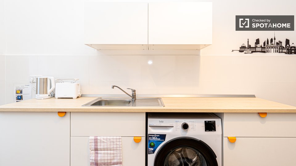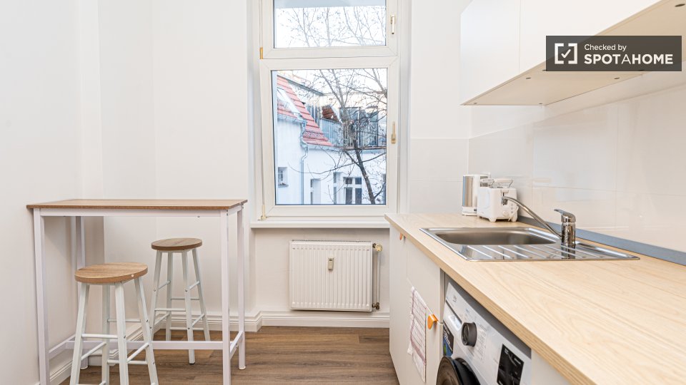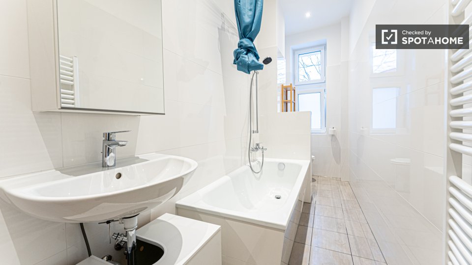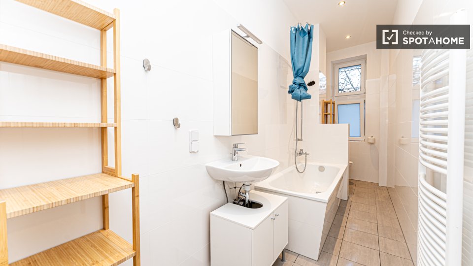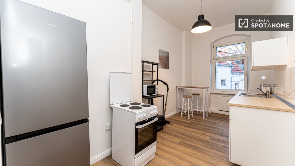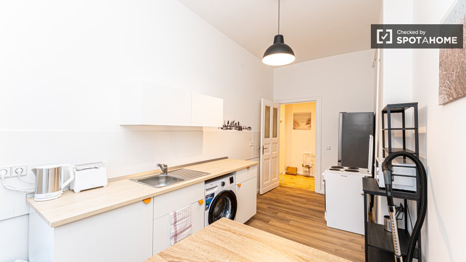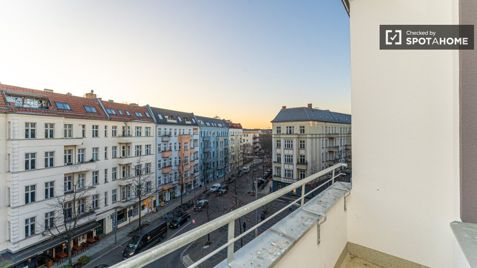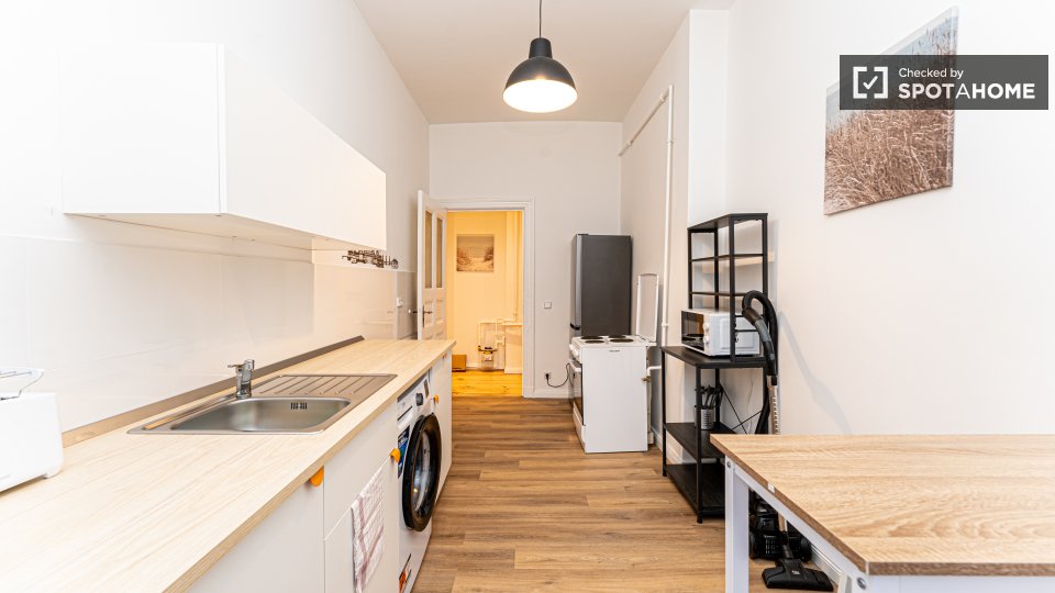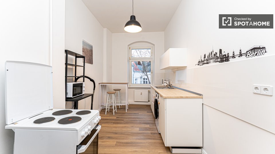 Pets not allowedNot allowedThis beautiful room is located in a shared 2-bedroom apartment in Berlin. It is well-equipped, featuring a private washing machine, an oven, and a balcony. The apartment is entirely furnished and exterior, ensuring a comfortable stay. It comes with an equipped kitchen and includes all necessary bills (water, electricity, gas, and WiFi) for convenience. It is worth noting that the property was personally verified by Spotahome for your peace of mind. Tenants can enjoy a vibrant life here as the property is meant for both professionals and students, but couples, pets, and smoking are not allowed.