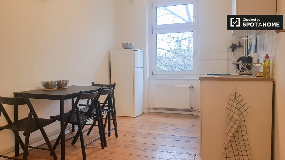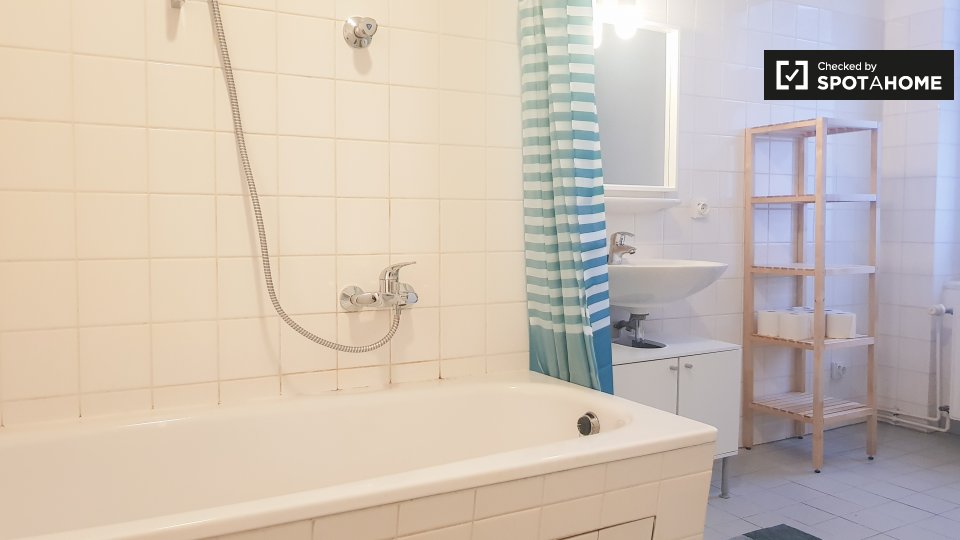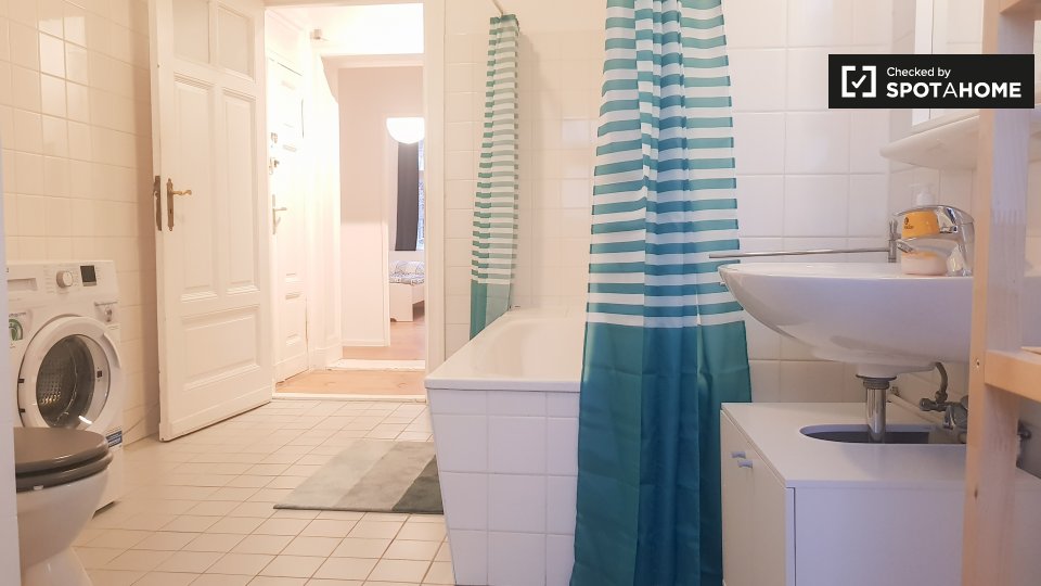 This is a modern 3rd floor, 4-bedroom apartment on Haubachstraße, Berlin. It's got a superb kitchen with an intimate dining area, and a huge bathroom with a bathtub.