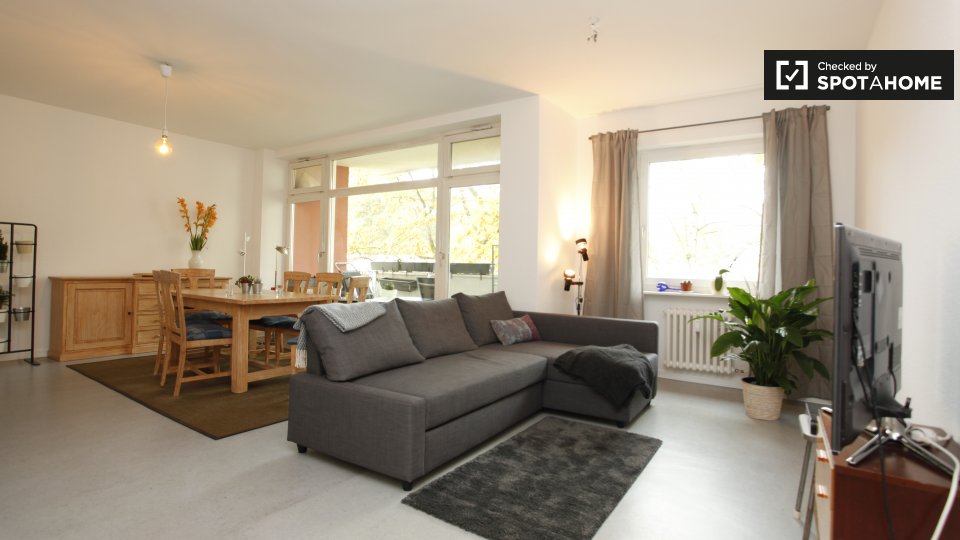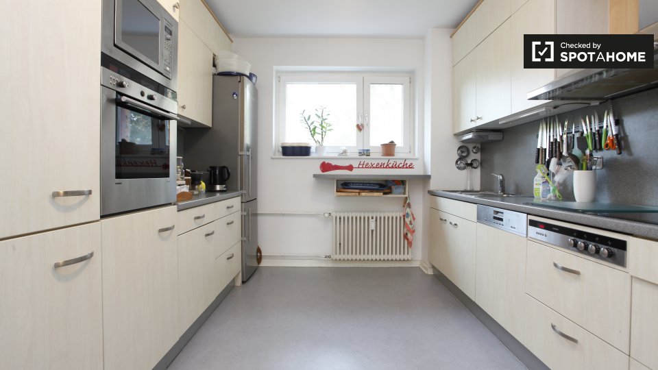 Pets not allowedNot allowedIf you want a comfy home in a quiet area, the room for rent in this large apartment on Edwin C Diltz Strasse will feel like a little slice of heaven. Entering into a small vestibule, you’ll find 3 doors. To the left is a hallway with a guest bathroom at the end, but there is another shared bathroom with a tub closer to your room. To the right is a very spacious and fully-equipped kitchen, which includes a dishwasher, as well as a washer and dryer. Directly in front of entrance is the combined living and dining room, furnished with a wonderful bookshelf, a 4-seat table and a cozy sofa in front of a flat screen TV. With a balcony off of this room, you definitely get ample light and you’ll get plenty of relaxation on the outdoor furniture too!