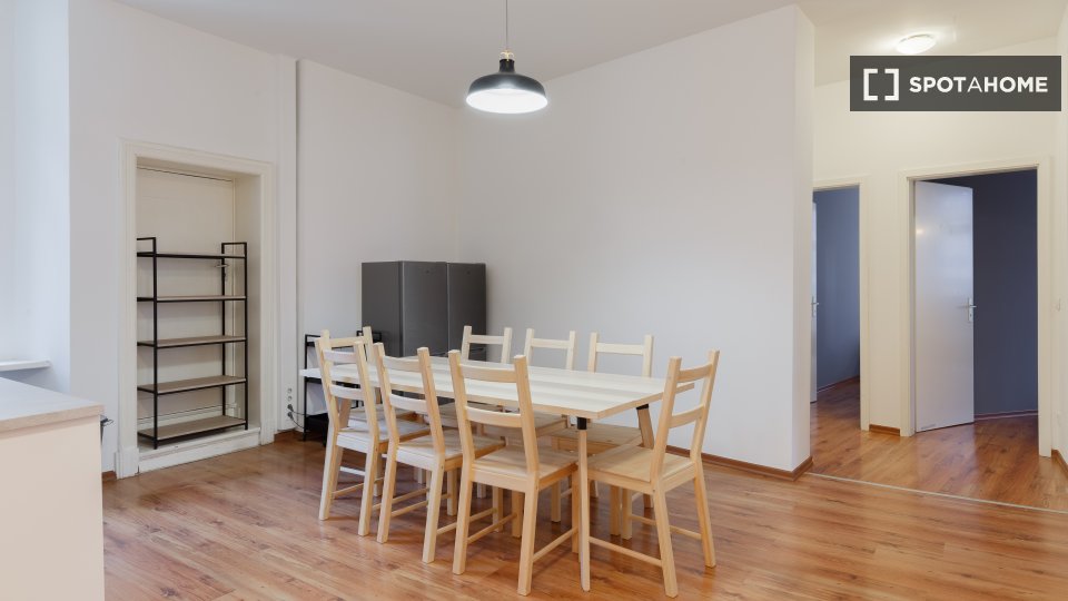 This modern apartment has everything you need for a comfortable daily life, including a shared kitchen, fully equipped with all the essentials, a dining room, and a washing machine to simplify your household chores.