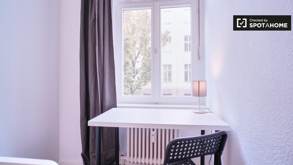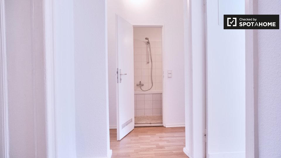 This is a minimalist 1st floor, 4-bedroom apartment on Wrangelstraße, Berlin. It boasts a fully equipped kitchen with a dining area, plus sunny bedrooms with modern style and all the essentials.