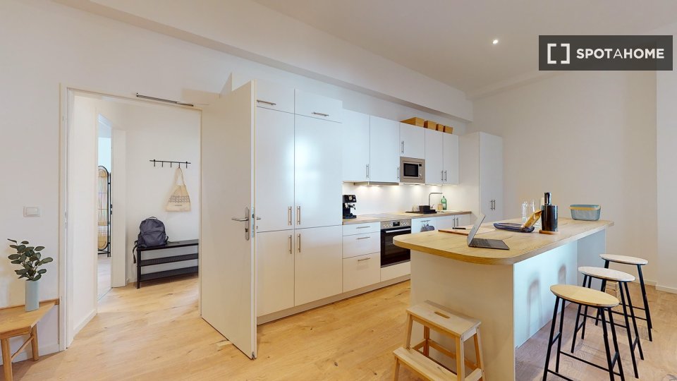 Pets not allowedNot allowedThe Building: with a total surface area of 220m2, the Building includes eight (8) Private Units and one (1) Semi-Common space on the ground floor. Common Spaces: the Common Spaces are accessible to all tenants and fully-equipped. They include an open living space, a kitchen, a dining space and a living room with movie projector; a laundry room with one (1) washing machine and one (1) tumble dryer and a small cleaning cabinet for Colonies. Bicycle parking is available for tenants in the courtyard. Private parking spots for your car are not available, however residents can park freely on the street.
