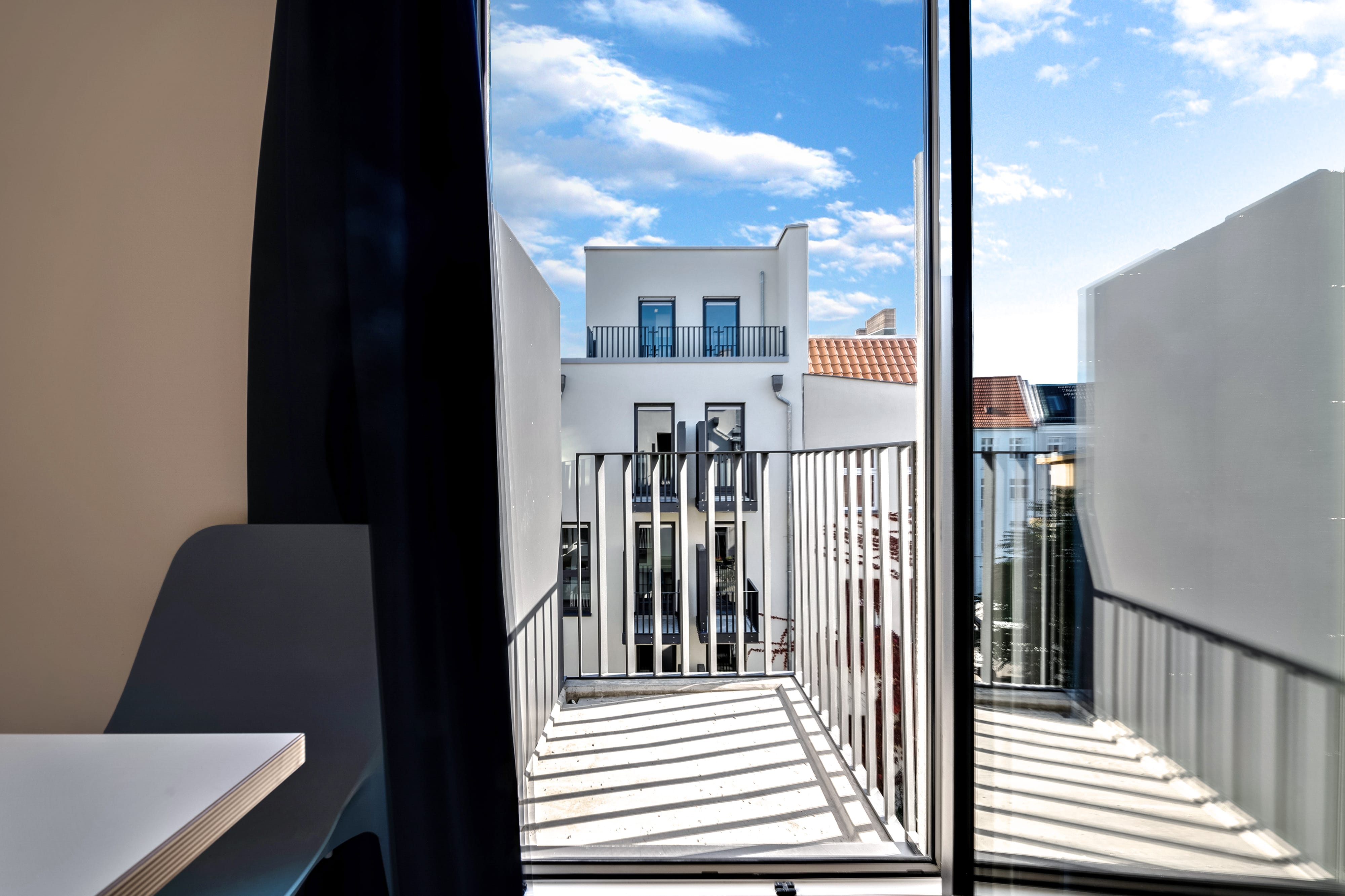 The shared rooms have a well-equipped communal kitchen with a large dining table. Of course, your room is lockable. Your room has a balcony