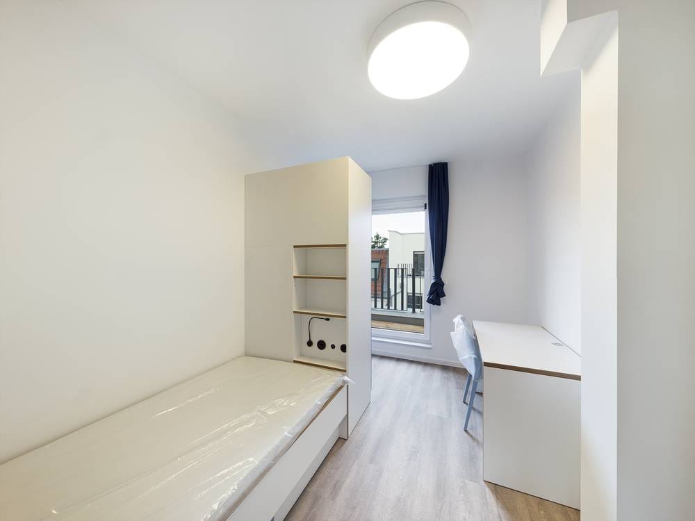 Shower, Mirror, Single bed (90x200), Wardrobe, Wardrobe, Cutlery, Pans & kitchen accessories, Fitted kitchen, Refrigerator, Microwave, Dishwasher, Dining Table, Shelf, Working desk, Vacuum Cleaner, Chairs