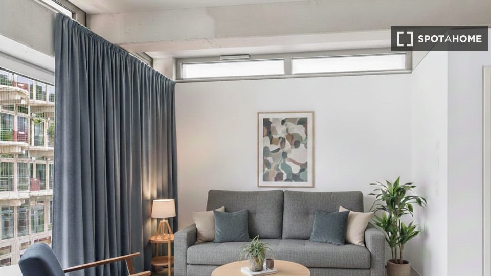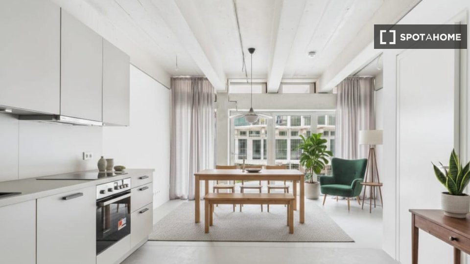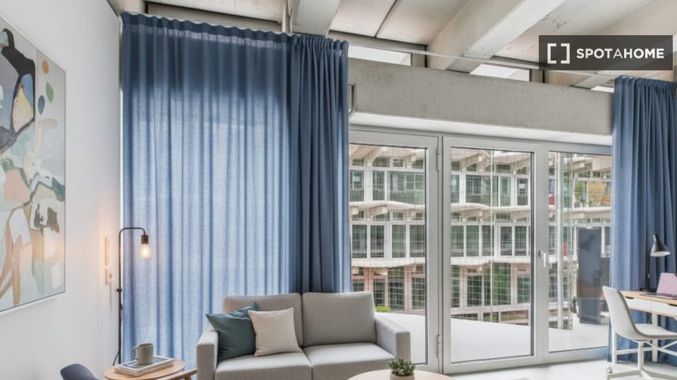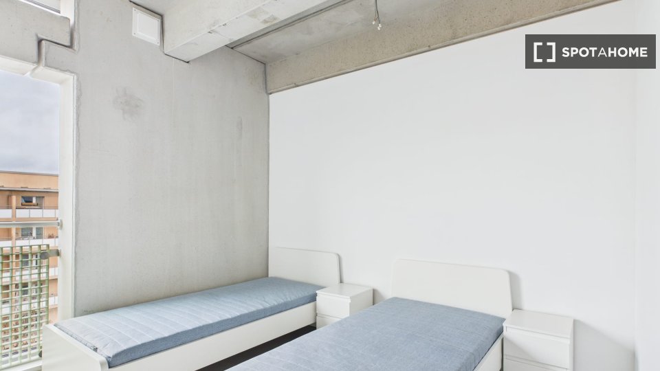 Large floor-to-ceiling windows, high ceilings, and a private balcony create a bright and pleasant living environment—perfect for both productivity and relaxation in a shared-living setup.