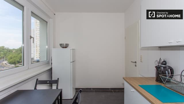 This is an amazing 7th floor, 4-bedroom apartment on Am Tierpark, Berlin. It boasts a neat kitchen, minimalist decor, and it's close to a huge zoo where you can spot all kinds of animals.