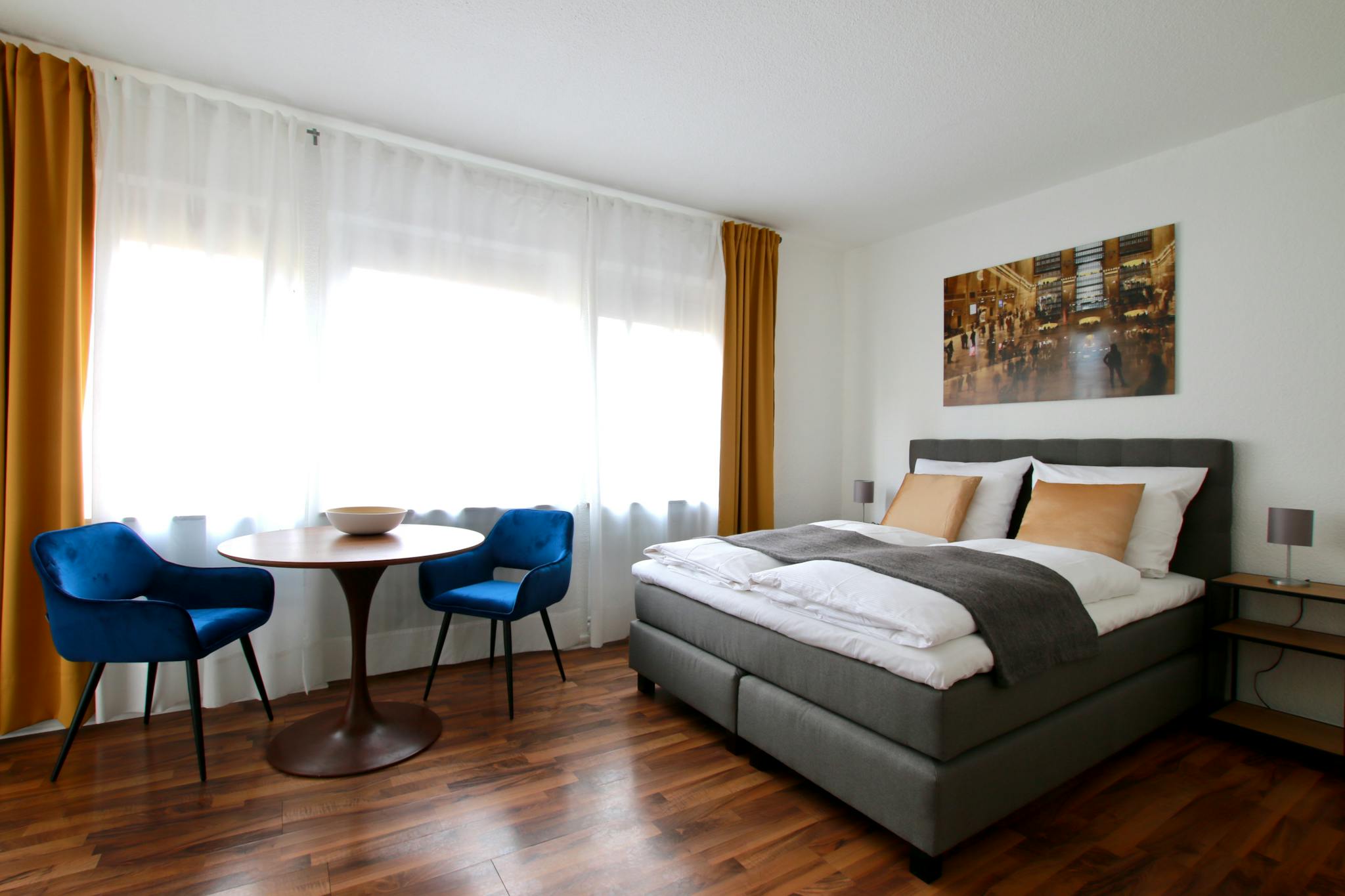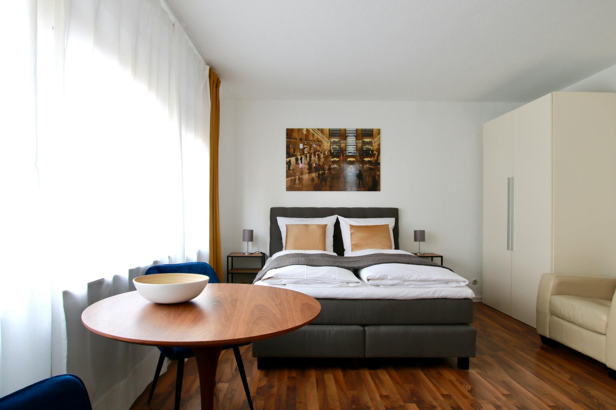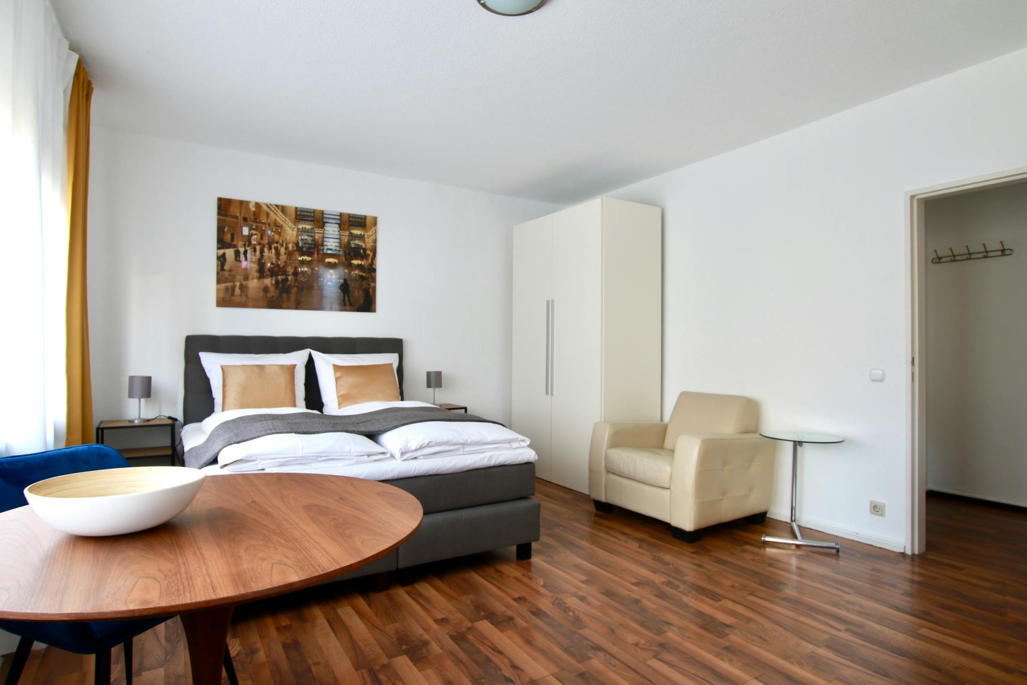 28qm großes Studio-Apartment im 2. OG eines 4-stöckigen Apartmenthauses und großer Fensterfront zu einer ruhigen Seitenstraße. Offener Wohnraum mit Laminatboden, Boxspringbett (180cm breit), Schrank, Bügeleisen & Bügelbrett, Sessel, TV, modernem Wannenbad mit Föhn, und voll ausgestatteter Küchenzeile mit Kühlschrank, Cerankochfeld, Wasserkocher, Kaffeemaschine, Toaster und Mikrowelle. Kostenloses Wlan ist verfügbar.
