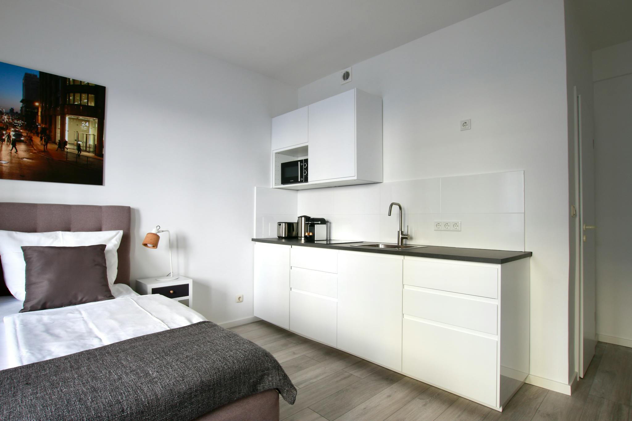 The 26 sqm apartment is modern and comfortable furnished. The flat is equipped with a comfortable queen size bed, a kitchenette with refrigerator, stove, microwave, coffee maker and a kettle. The bath has a shower. A blow-dryer, towels and linens for the bed are supplied.