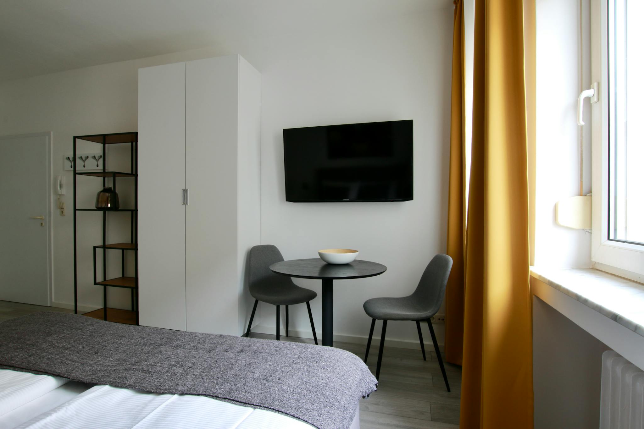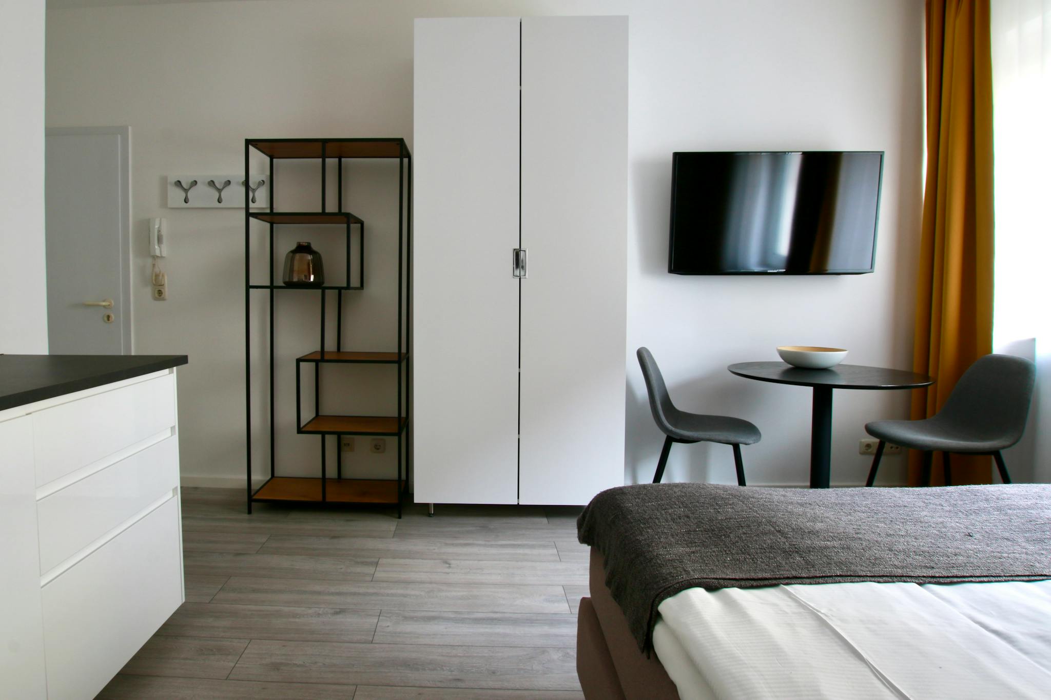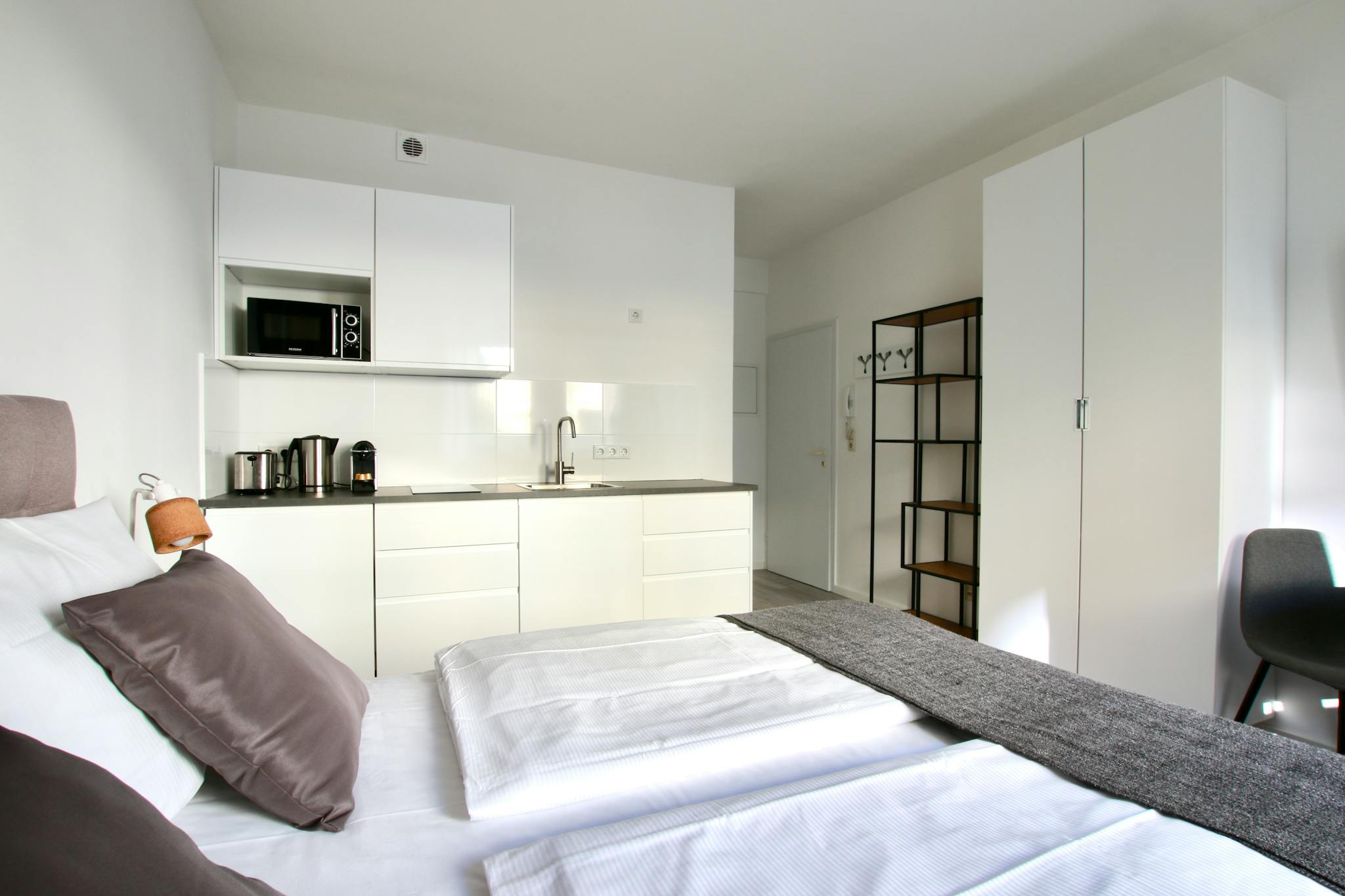 Das 26 qm Apartment ist komfortabel und modern eingerichtet. Es verfügt ein bequemes Boxspringbett, eine Küchenzeile mit Kühlschrank, Kochfeld, Mikrowelle, Kaffeemaschine und einem Wasserkocher. Das Bad ist mit einer einer Dusche ausgestattet. Fön, Handtücher und Bettwäsche sind vorhanden.
