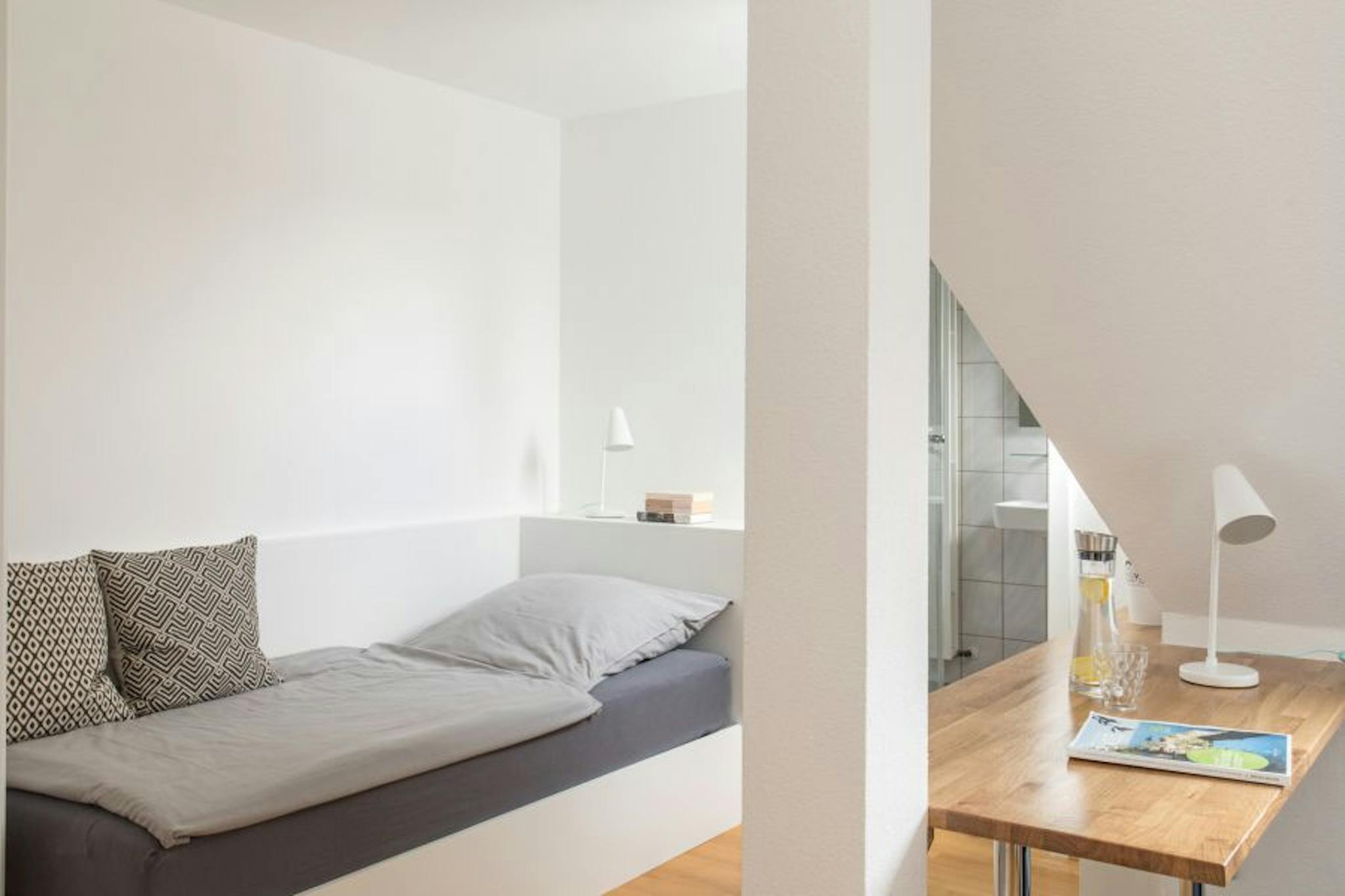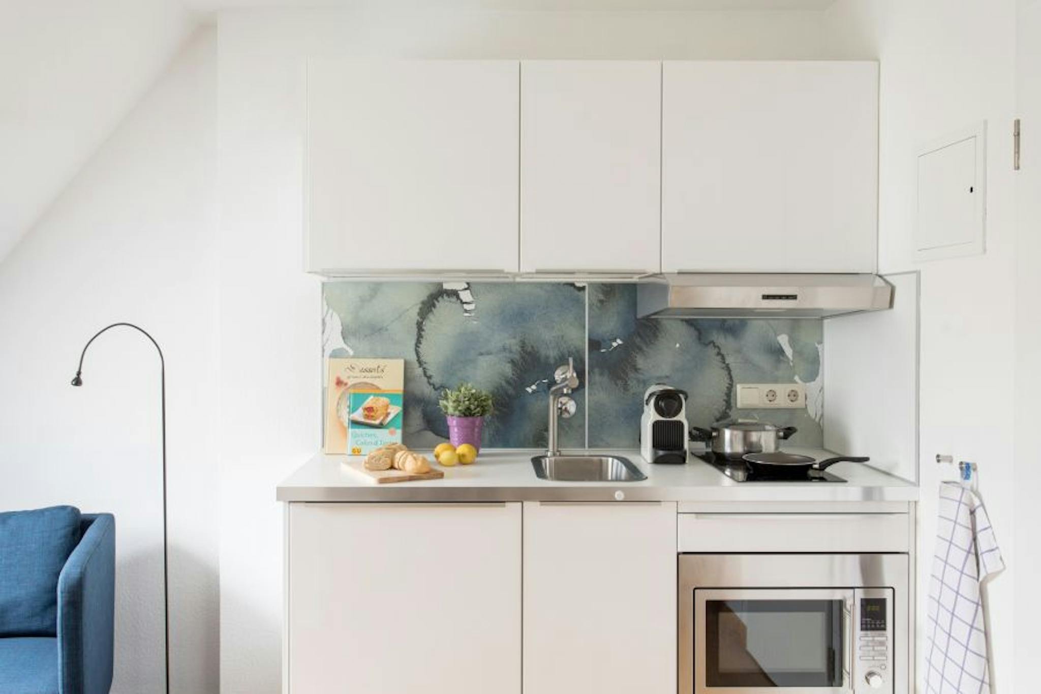 Geräumigkeit, eine hohe Decke und zeitgenössisches Design schaffen in dieser stilvoll eingerichteten Wohnung eine Wohlfühlatmosphäre mit persönlicher Note, die keine Wünsche offen lässt. Das Studio besteht aus einem Wohn-/Schlafraum, der mit einem Schreibtisch/Esstisch, einem bequemen Bett (Größe 0,90 m x 2,00 m) und einem großen Flachbildfernseher (schwenkbar) ausgestattet ist. Das Studio ist größtenteils mit Parkettboden ausgestattet und bietet eine moderne, offene Küchenzeile mit Kühlschrank, Cerankochfeld, Mikrowelle, Wasserkocher und Nespresso-Kaffeemaschine. Das schöne Badezimmer ist von natürlichem Licht durchflutet.