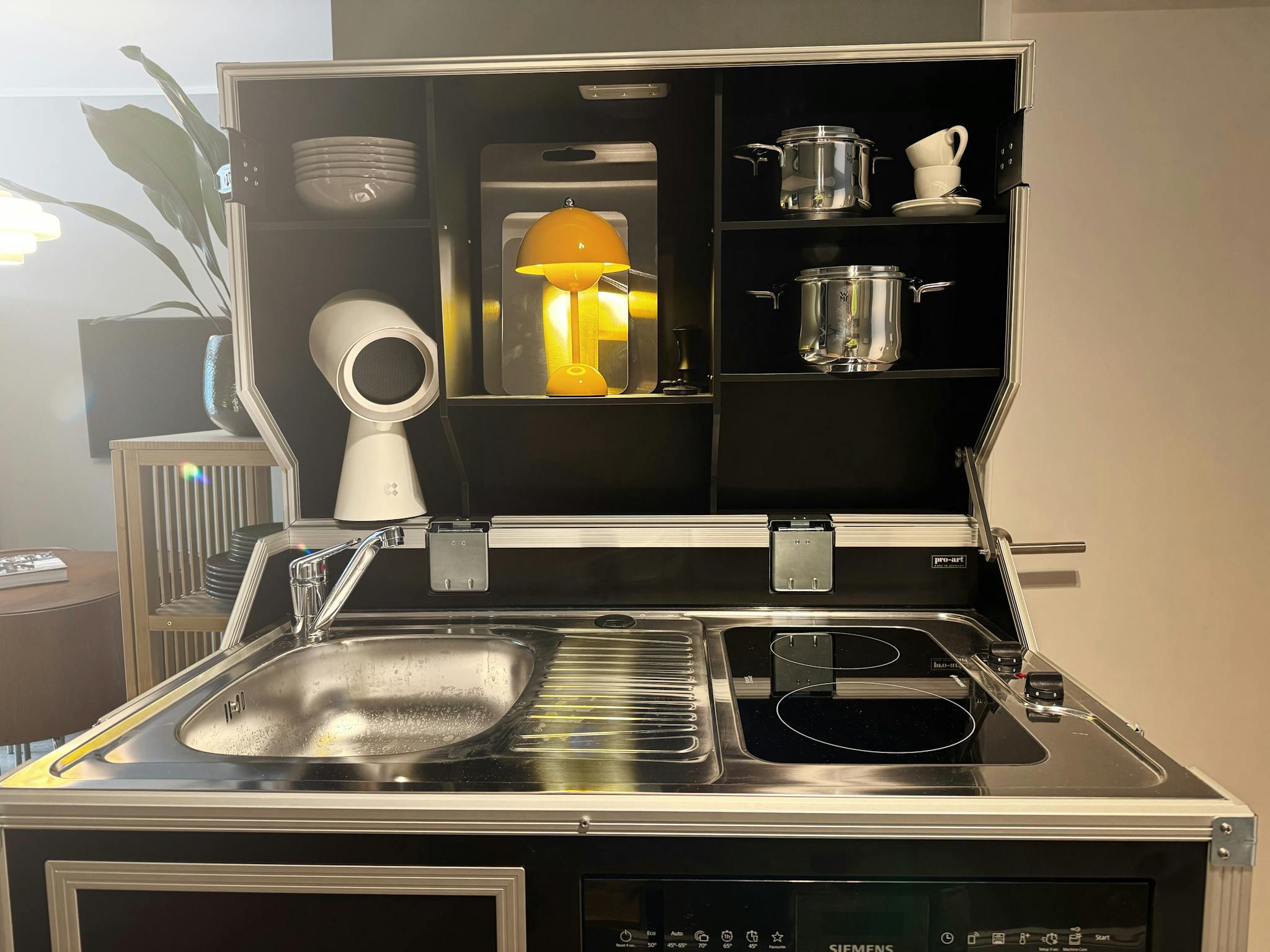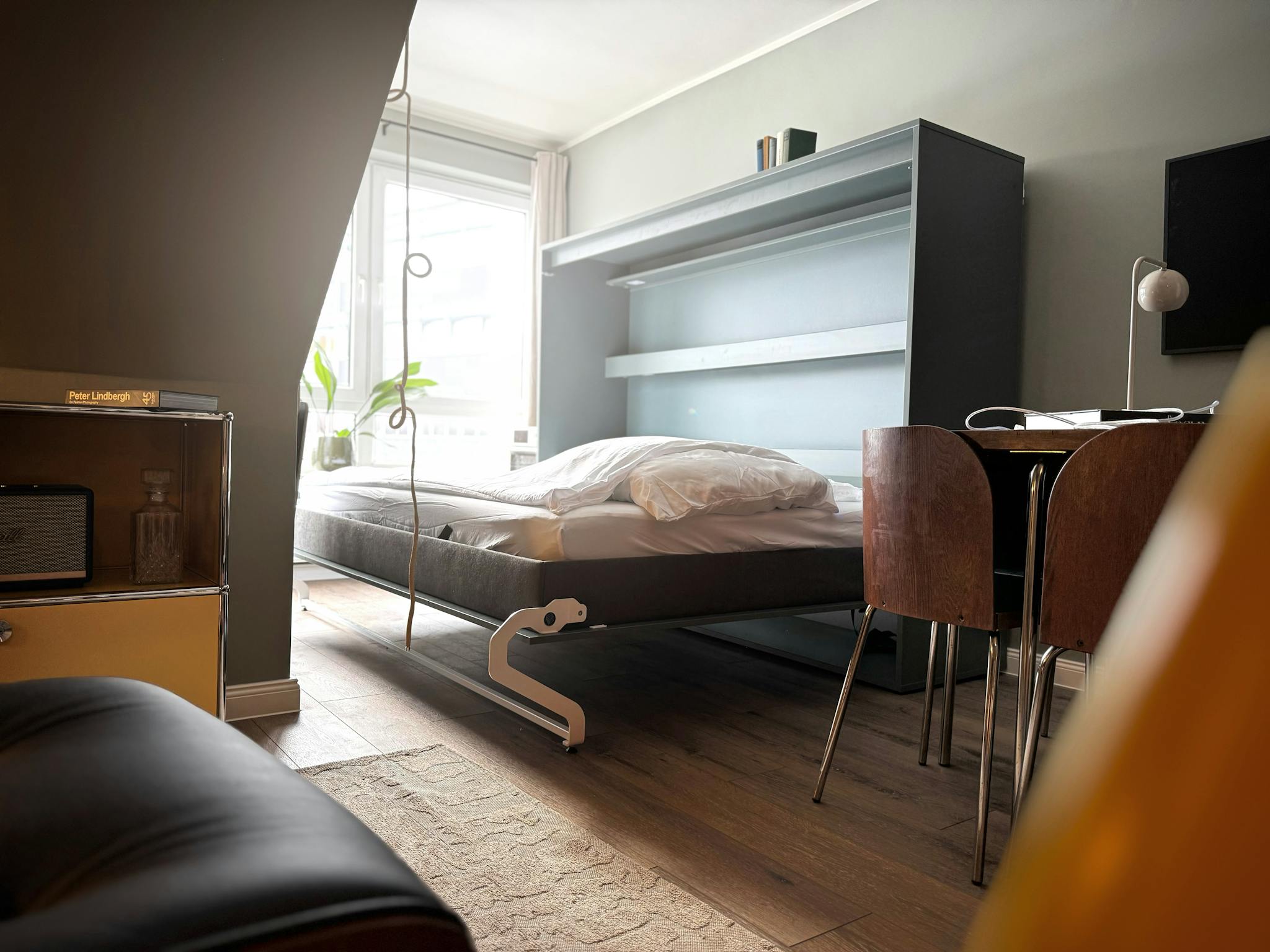 Der Wohn- und Schlafbereich ist intelligent zoniert und verfügt über ein USM-Stauraumsystem, eine komfortable Lounge-Ecke sowie einen flexiblen Ess- und Arbeitsbereich. Ein Designer-Klappschreibtisch ermöglicht fokussiertes Arbeiten, ohne Platz zu beanspruchen. Großer Smart TV.